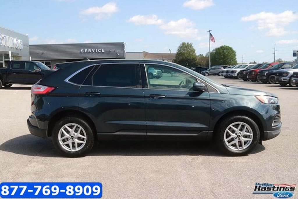 Blue Metallic 2024 Ford Edge SEL AWD 8-Speed Automatic EcoBoost 2.0L I4 GTDi DOHC Turbocharged VCT AWD, 3.80 Axle Ratio, 4-Wheel Disc Brakes, 6 Speakers, ABS brakes, ActiveX Trimmed Heated Bucket Seats, Air Conditioning, Alloy wheels, AM/FM radio: SiriusXM with 360L, AM/FM Stereo, Auto High-beam Headlights, Auto-dimming Rear-View mirror, Automatic temperature control, Brake assist, Bumpers: body-color, Compass, Delay-off headlights, Driver door bin, Driver vanity mirror, Dual front impact airbags, Dual front side impact airbags, Electronic Stability Control, Emergency communication system: SYNC 4 911 Assist, FordPass Connect, Four wheel independent suspension, Front anti-roll bar, Front Bucket Seats, Front Center Armrest w/Storage, Front dual zone A/C, Front License Plate Bracket, Front reading lights, Fully automatic headlights, Heated door mirrors, Heated front seats, Illuminated entry, Knee airbag, Leather steering wheel, Low tire pressure warning, Occupant sensing airbag, Outside temperature display, Overhead airbag, Overhead console, Panic alarm, Passenger door bin, Passenger vanity mirror, Power door mirrors, Power driver seat, Power Liftgate, Power passenger seat, Power steering, Power windows, Rear anti-roll bar, Rear Parking Sensors, Rear reading lights, Rear seat center armrest, Rear window defroster, Rear window wiper, Remote keyless entry, SiriusXM w/360L, Speed control, Speed-Sensitive Wipers, Split folding rear seat, Spoiler, Steering wheel mounted audio controls, SYNC 4A w/Enhanced Voice Recognition, Tachometer, Telescoping steering wheel, Tilt steering wheel, Traction control, Trip computer, Variably intermittent wipers, AWD.