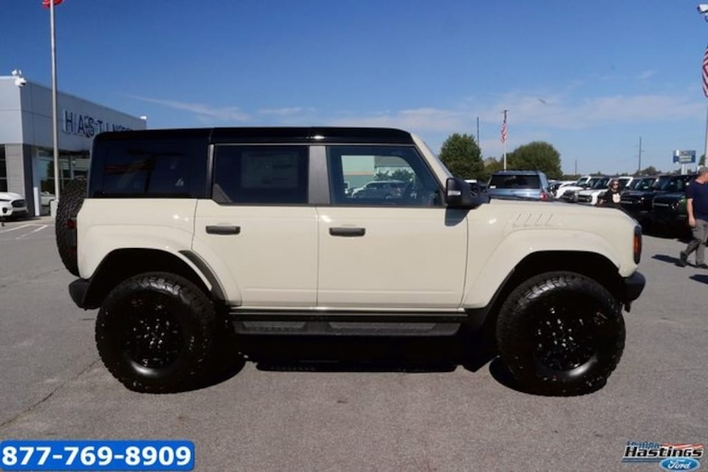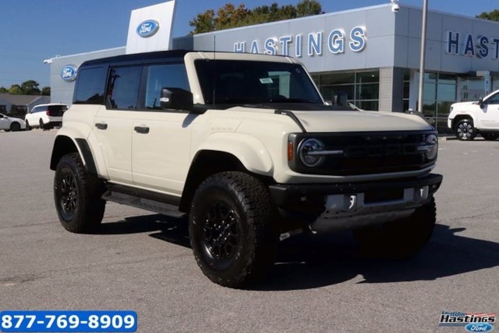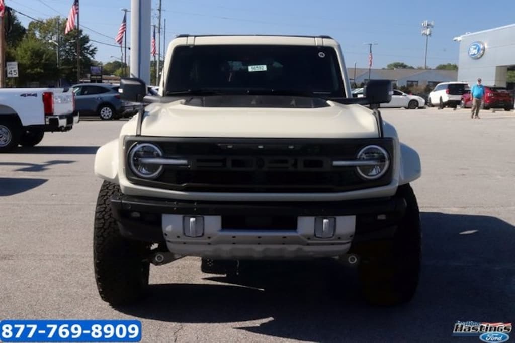 Desert Sand 2025 Ford Bronco Raptor 4WD 10-Speed Automatic 3.0L EcoBoost V6 12 Speakers, 4-Wheel Disc Brakes, ABS brakes, Air Conditioning, Alloy wheels, AM/FM radio: SiriusXM with 360L, Auto High-beam Headlights, Auto-dimming Rear-View mirror, Automatic temperature control, Brake assist, Compass, Connected Navigation, Convertible HardTop, Convertible roof lining, Delay-off headlights, Driver door bin, Driver vanity mirror, Dual front impact airbags, Dual front side impact airbags, Electronic Stability Control, Emergency communication system: 911 Assist, Exterior Parking Camera Rear, Front anti-roll bar, Front Bucket Seats, Front Center Armrest, Front dual zone A/C, Front fog lights, Front reading lights, Front wheel independent suspension, Fully automatic headlights, Garage door transmitter, Glass rear window, Heated door mirrors, Heated front seats, Heated steering wheel, Illuminated entry, Integrated roll-over protection, Leather Shift Knob, Low tire pressure warning, Marine Grade Vinyl Bucket Seats, Navigation system: Connected Navigation, Occupant sensing airbag, Outside temperature display, Overhead airbag, Overhead console, Panic alarm, Passenger door bin, Passenger vanity mirror, Power door mirrors, Power steering, Power windows, Radio data system, Radio: B&O Sound System by Bang & Olufsen, Rear anti-roll bar, Rear seat center armrest, Rear window defroster, Rear window wiper, Remote keyless entry, Security system, SiriusXM w/360L, Speed control, Split folding rear seat, Steering wheel mounted audio controls, SYNC 4, Tachometer, Telescoping steering wheel, Tilt steering wheel, Traction control, Trip computer, Turn signal indicator mirrors, Variably intermittent wipers, Voltmeter, Wheels: 17" Black High Gloss-Painted Aluminum.