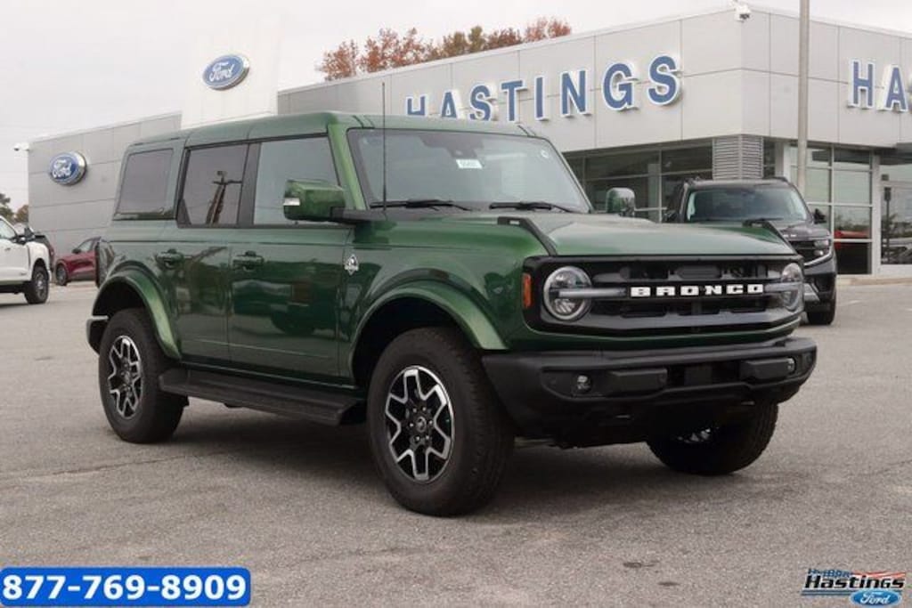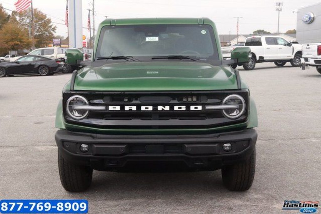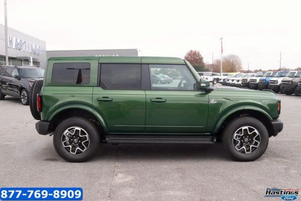 Eruption Green Metallic 2025 Ford Bronco Outer Banks 4WD 10-Speed Automatic 2.7L EcoBoost V6 18" Bright Machined Aluminum Wheels, 3.73 Axle Ratio, 360-Degree Camera, 4-Wheel Disc Brakes, 7 Speakers, ABS brakes, Adaptive Cruise Control, Air Conditioning, Alloy wheels, AM/FM radio: SiriusXM with 360L, AM/FM Stereo, Auto High-beam Headlights, Auto-dimming Rear-View mirror, Automatic temperature control, Brake assist, Compass, Connected Navigation, Delay-off headlights, Driver door bin, Driver vanity mirror, Dual front impact airbags, Dual front side impact airbags, Electronic Stability Control, Emergency communication system: 911 Assist, Equipment Group 314A Lux Package, Evasive Steering Assist, Exterior Parking Camera Rear, Front anti-roll bar, Front Bucket Seats, Front Center Armrest, Front dual zone A/C, Front fog lights, Front License Plate Bracket, Front Parking Sensors, Front reading lights, Front wheel independent suspension, Fully automatic headlights, Hard Top Sound Deadening Headliner, Heated door mirrors, Heated front seats, Heated Leather-Trimmed/Vinyl Bucket Seats, Heated steering wheel, Illuminated entry, Information on Demand Panel, Integrated roll-over protection, Internet access capable: FordPass Connect, Leather Shift Knob, Low tire pressure warning, Navigation system: Connected Navigation, Occupant sensing airbag, Outside temperature display, Overhead airbag, Overhead console, Painted Hard Top, Panic alarm, Passenger door bin, Passenger vanity mirror, Power door mirrors, Power driver seat, Power passenger seat, Power steering, Power windows, Radio data system, Radio: B&O Sound System by Bang & Olufsen, Rear seat center armrest, Rear-Window Defroster & Washer, Remote keyless entry, Security system, Sideview Mirrors, SiriusXM w/360L, Speed control, Split folding rear seat, Steering wheel mounted audio controls, SYNC 4, Tachometer, Telescoping steering wheel, Tilt steering wheel, Traction control, Trip computer, Universal Garage Door Opener, Variably intermittent wipers, Voltmeter. Price includes: $2500 - Retail Customer Cash. Exp. 03/31/2026