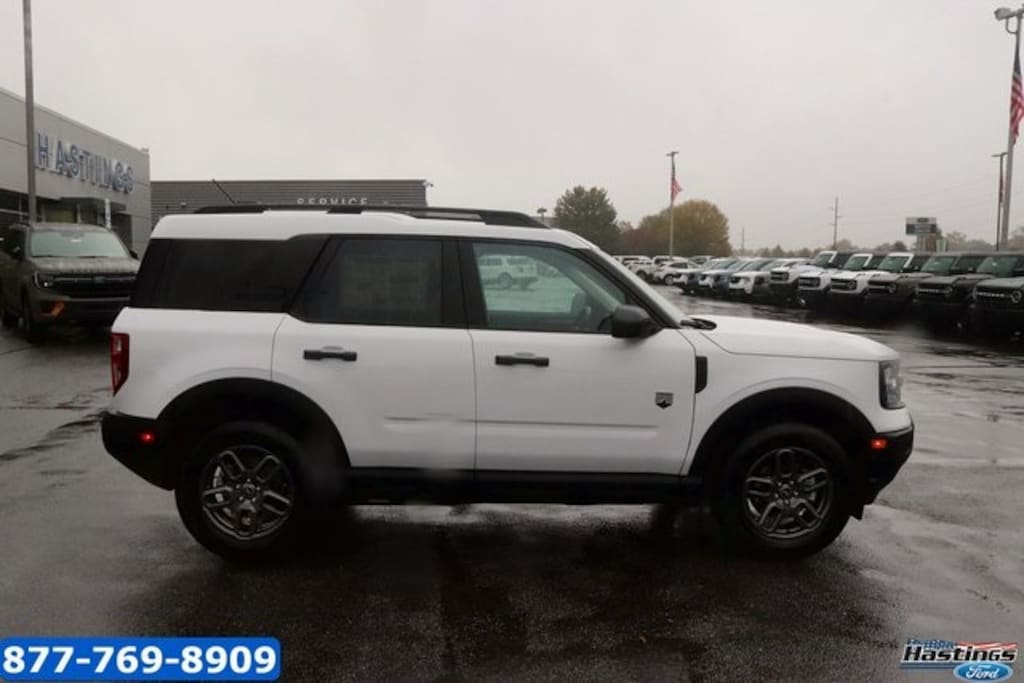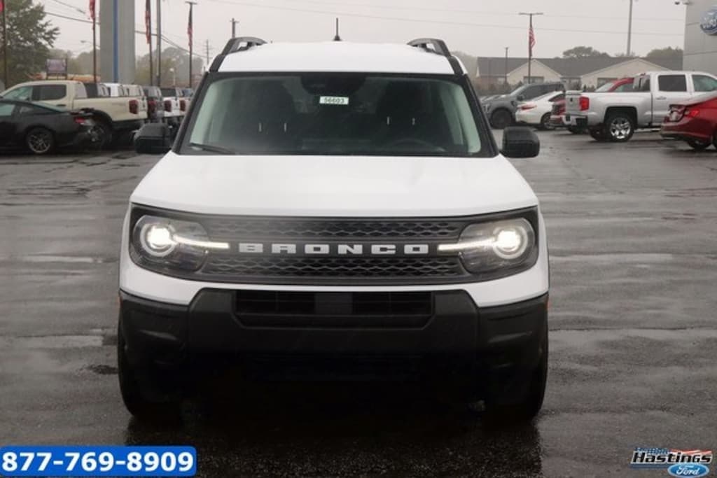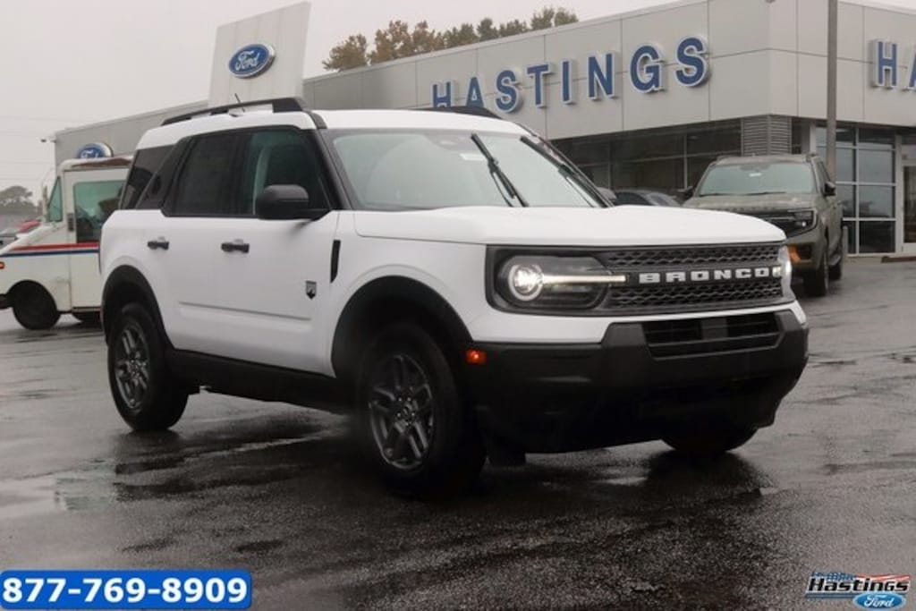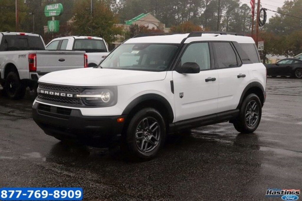 Oxford White 2025 Ford Bronco Sport Big Bend 4WD 8-Speed Automatic 1.5L EcoBoost 4-Wheel Disc Brakes, 6 Speakers, ABS brakes, Air Conditioning, Alloy wheels, AM/FM radio: SiriusXM, AM/FM Stereo, Auto High-beam Headlights, Automatic temperature control, Brake assist, Cloth w/Easy-to-Clean Front Bucket Seats, Compass, Delay-off headlights, Driver door bin, Driver vanity mirror, Dual front impact airbags, Dual front side impact airbags, Electronic Stability Control, Emergency communication system: SYNC 4 911 Assist, Four wheel independent suspension, Front anti-roll bar, Front Bucket Seats, Front Center Armrest, Front reading lights, Fully automatic headlights, Heated door mirrors, Illuminated entry, Knee airbag, Low tire pressure warning, Occupant sensing airbag, Outside temperature display, Overhead airbag, Overhead console, Panic alarm, Passenger door bin, Passenger vanity mirror, Power door mirrors, Power steering, Power windows, Radio data system, Rear anti-roll bar, Rear Parking Sensors, Rear reading lights, Rear seat center armrest, Rear window defroster, Rear window wiper, Remote keyless entry, Security system, SiriusXM, Speed control, Speed-sensing steering, Speed-Sensitive Wipers, Split folding rear seat, Steering wheel mounted audio controls, SYNC 4 w/Enhanced Voice Recognition, Tachometer, Telescoping steering wheel, Tilt steering wheel, Traction control, Trip computer, Variably intermittent wipers, Wheels: 17" Carbonized Gray-Painted Aluminum.