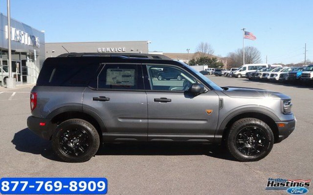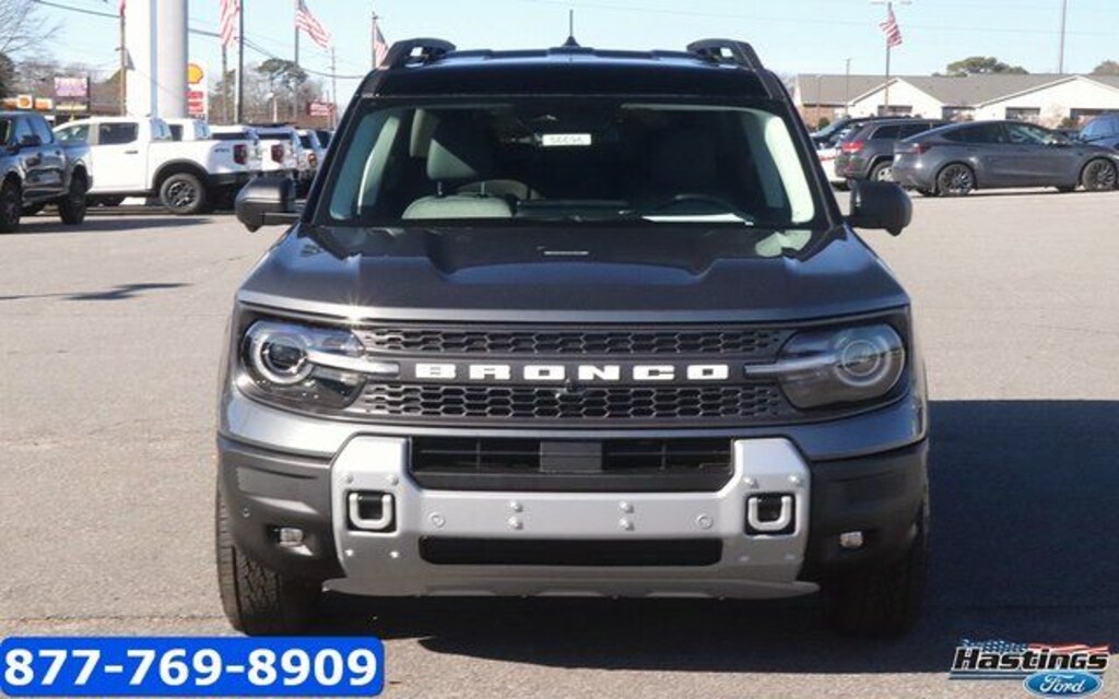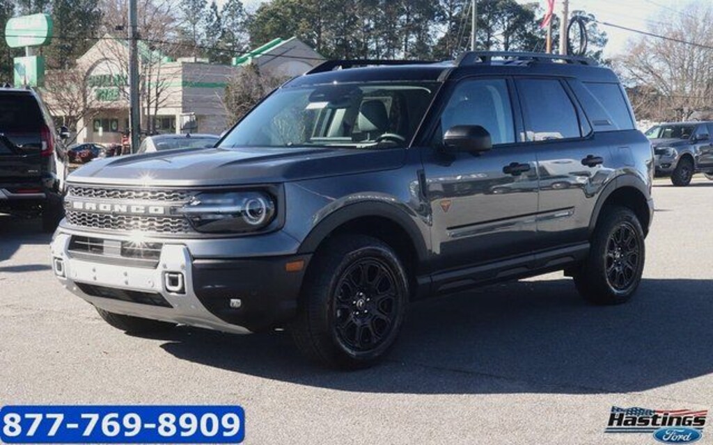 Carbonized Gray Metallic 2025 Ford Bronco Sport Badlands 4WD 8-Speed Automatic EcoBoost 2.0L I4 GTDi DOHC Turbocharged VCT 4-Wheel Disc Brakes, 6 Speakers, ABS brakes, Air Conditioning, Alloy wheels, AM/FM radio: SiriusXM, AM/FM Stereo, Auto High-beam Headlights, Auto-dimming Rear-View mirror, Automatic temperature control, B&O Sound System by Bang & Olufsen, Badlands Tech Package, Brake assist, Compass, Connected Navigation, Delay-off headlights, Driver door bin, Driver vanity mirror, Dual front impact airbags, Dual front side impact airbags, Electronic Stability Control, Emergency communication system: SYNC 4 911 Assist, Equipment Group 400A, Four wheel independent suspension, Front anti-roll bar, Front Bucket Seats, Front Center Armrest, Front fog lights, Front reading lights, Fully automatic headlights, Garage door transmitter, HD Radio, Heated door mirrors, Heated front seats, Heated steering wheel, Illuminated entry, Knee airbag, Leather Trimmed Front Bucket Seats, Low tire pressure warning, Memory seat, Occupant sensing airbag, Outside temperature display, Overhead airbag, Overhead console, Panic alarm, Passenger door bin, Passenger vanity mirror, Power door mirrors, Power driver seat, Power passenger seat, Power steering, Power windows, Radio data system, Rear anti-roll bar, Rear reading lights, Rear seat center armrest, Rear window defroster, Rear window wiper, Remote keyless entry, Security system, SiriusXM, Speed control, Speed-sensing steering, Speed-Sensitive Wipers, Split folding rear seat, Steering wheel mounted audio controls, SYNC 4 w/Enhanced Voice Recognition, Tachometer, Telescoping steering wheel, Tilt steering wheel, Traction control, Trip computer, Variably intermittent wipers, Wheels: 17" Matte Black-Painted Aluminum.