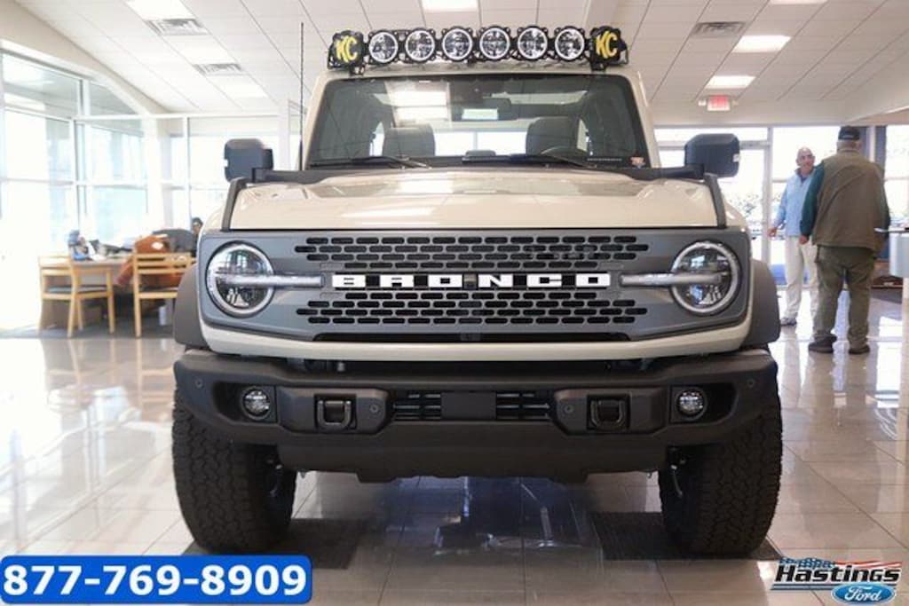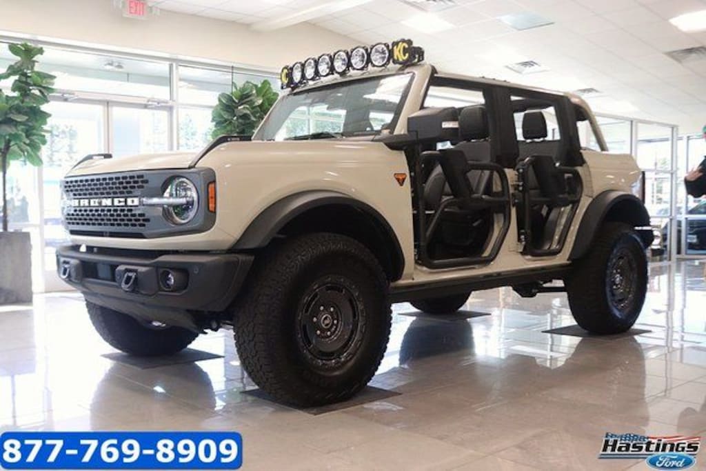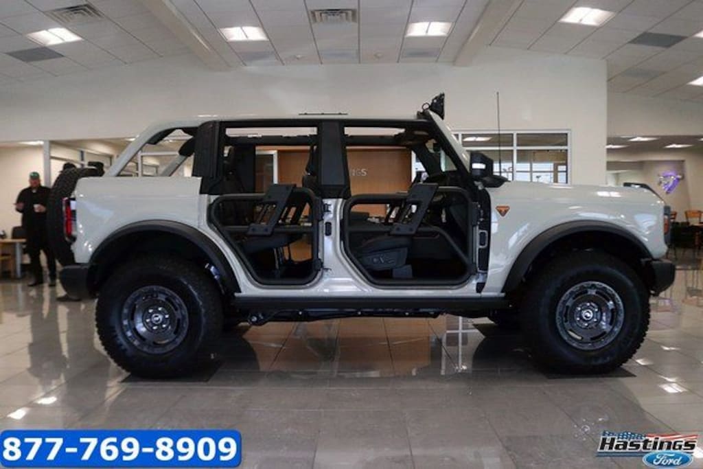 Desert Sand 2025 Ford Bronco Badlands 4WD 10-Speed Automatic 2.7L EcoBoost V6 2-Door Intelligent Access w/Lock/Unlock, 360-Degree Camera, 4-Wheel Disc Brakes, 7 Speakers, ABS brakes, Adaptive Cruise Control, Air Conditioning, Alloy wheels, AM/FM radio: SiriusXM with 360L, AM/FM Stereo, Ambient Footwell Lighting, Auto High-Beam Headlamps, Auto High-beam Headlights, Auto-dimming Rear-View mirror, BLIS Blind Spot Information System, Brake assist, Compass, Connected Navigation, Delay-off headlights, Dr & Pass Illuminated Sliding Visor Vanity Mirrors, Driver door bin, Driver vanity mirror, Dual front impact airbags, Dual front side impact airbags, Dual Smart Charging USB Ports, Dual-Zone Electronic Automatic Temperature Control, Electronic Stability Control, Emergency communication system: 911 Assist, Equipment Group 334A Lux Package, Evasive Steering Assist, Exterior Parking Camera Rear, Front anti-roll bar, Front Bucket Seats, Front Center Armrest, Front fog lights, Front License Plate Bracket, Front Parking Sensors, Front reading lights, Front Row Heated Seats, Front wheel independent suspension, Fully automatic headlights, Hard Top Sound Deadening Headliner, Heated door mirrors, Heated front seats, Heated steering wheel, High Clearance Fender Flares, High Clearance Suspension, Illuminated entry, Information on Demand Panel, Integrated roll-over protection, Internet access capable: FordPass Connect, Lane-Keeping System, Leather Shift Knob, Low tire pressure warning, Marine Grade Vinyl Heated Bucket Seats, Occupant sensing airbag, Outside temperature display, Overhead airbag, Overhead console, Panic alarm, Passenger door bin, Passenger vanity mirror, Position-Sensitive Bilstein Shock Absorbers, Power door mirrors, Power Outlet - Back Side of Center Floor Console, Power steering, Power windows, Pre-Collision Assist w/Automatic Emergency Braking, Radio data system, Radio: B&O Sound System by Bang & Olufsen, Rear Parking Sensors, Rear-View Camera, Rear-Window Defroster & Washer, Remote keyless entry, Sasquatch Package, Security system, Shadow Black Painted Hard Top, Sideview Mirrors, SiriusXM w/360L, Speed control, Split folding rear seat, Steering wheel mounted audio controls, SYNC 4, Tachometer, Telescoping steering wheel, Tilt steering wheel, Traction control, Trip computer, Universal Garage Door Opener, Variably intermittent wipers, Voltmeter, Wheels: 17" Carbonized Gray Painted Aluminum, Wheels: 17" Carbonized Gray-Painted Aluminum. Price includes: $2500 - Retail Customer Cash. Exp. 03/31/2026