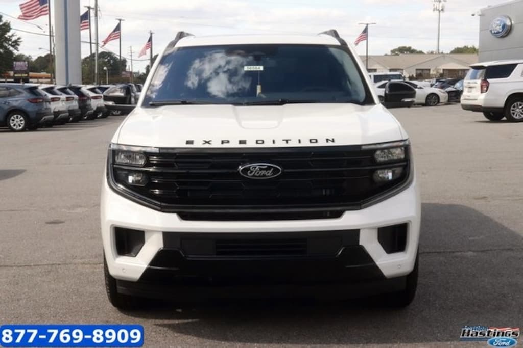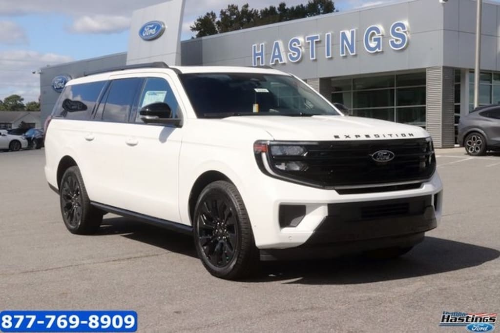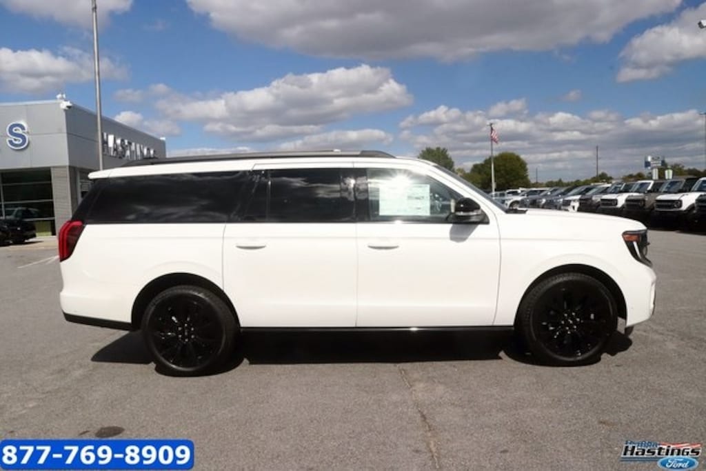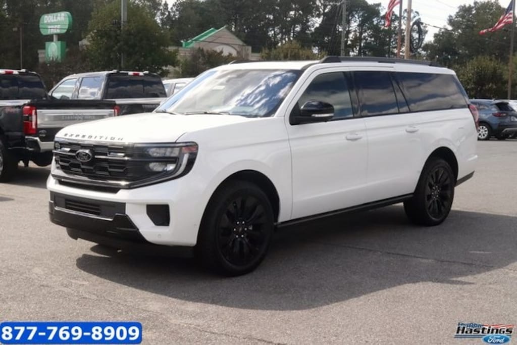Star White Metallic Tri-Coat 2025 Ford Expedition Max Platinum 4WD 10-Speed Automatic EcoBoost 3.5L V6 GTDi DOHC 24V Twin Turbocharged 10 Speakers, 2nd Row Power-Folding Captain's Chairs, 3.73 Axle Ratio, 3rd row seats: split-bench, 4-Wheel Disc Brakes, ABS brakes, Adjustable pedals, Air Conditioning, Alloy wheels, AM/FM radio: SiriusXM with 360L, Apple CarPlay/Android Auto, Auto High-beam Headlights, Auto-dimming door mirrors, Auto-dimming Rear-View mirror, Automatic temperature control, Brake assist, Bumpers: body-color, Compass, Delay-off headlights, Driver door bin, Driver vanity mirror, Dual front impact airbags, Dual front side impact airbags, Electronic Stability Control, Emergency communication system: 911 Assist, Exterior Parking Camera Rear, Four wheel independent suspension, Front anti-roll bar, Front Bucket Seats, Front Center Armrest, Front dual zone A/C, Front reading lights, Fully automatic headlights, Garage door transmitter, Genuine wood dashboard insert, Genuine wood door panel insert, Heated & Ventilated Leather Front Captain's Chairs, Heated door mirrors, Heated front seats, Heated rear seats, Heated steering wheel, Illuminated entry, Leather steering wheel, Low tire pressure warning, Memory seat, Navigation System, Occupant sensing airbag, Outside temperature display, Overhead airbag, Overhead console, Panic alarm, Passenger door bin, Passenger vanity mirror, Pedal memory, Power door mirrors, Power driver seat, Power moonroof: Vista Roof, Power passenger seat, Power steering, Power windows, Radio data system, Radio: B&O Sound System by Bang & Olufsen, Rain sensing wipers, Rear air conditioning, Rear anti-roll bar, Rear reading lights, Rear window defroster, Rear window wiper, Reclining 3rd row seat, Remote keyless entry, Security system, SiriusXM w/360L, Speed control, Speed-sensing steering, Speed-Sensitive Wipers, Split folding rear seat, Spoiler, Steering wheel memory, Steering wheel mounted audio controls, Tachometer, Telescoping steering wheel, Tilt steering wheel, Traction control, Trip computer, Turn signal indicator mirrors, Variably intermittent wipers, Ventilated front seats, Voltmeter, Wheels: 20" Ebony Bright Machined Aluminum.