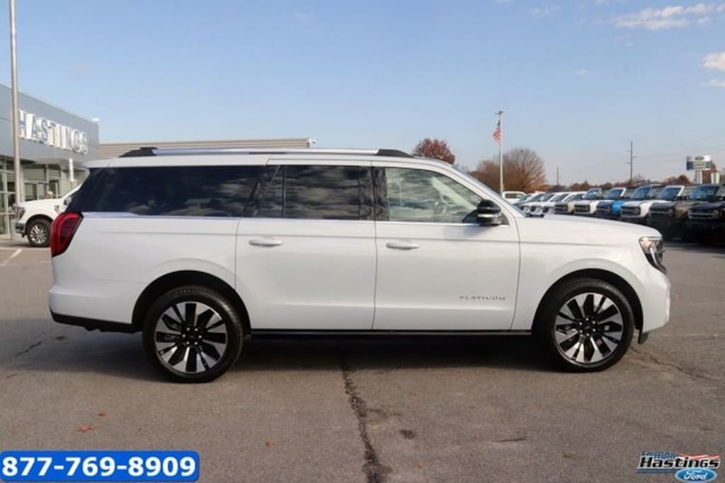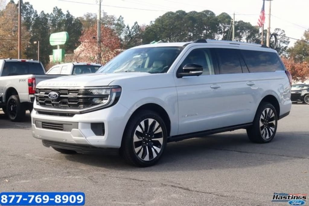 Space Silver Metallic 2025 Ford Expedition Max Platinum 4WD 10-Speed Automatic EcoBoost 3.5L V6 GTDi DOHC 24V Twin Turbocharged 10 Speakers, 2nd Row Power-Folding Captain's Chairs, 3.73 Axle Ratio, 3rd row seats: split-bench, 4-Wheel Disc Brakes, ABS brakes, Adjustable pedals, Air Conditioning, Alloy wheels, AM/FM radio: SiriusXM with 360L, Apple CarPlay/Android Auto, Auto High-beam Headlights, Auto-dimming door mirrors, Auto-dimming Rear-View mirror, Automatic temperature control, Brake assist, Bumpers: body-color, Compass, Continuous Control Damping Suspension, Delay-off headlights, Driver door bin, Driver vanity mirror, Driver's Package, Dual front impact airbags, Dual front side impact airbags, Electronic Stability Control, Emergency communication system: 911 Assist, Equipment Group 600A Standard Package, Exterior Parking Camera Rear, Four wheel independent suspension, Front anti-roll bar, Front Bucket Seats, Front Center Armrest, Front dual zone A/C, Front reading lights, Fully automatic headlights, Garage door transmitter, Genuine wood dashboard insert, Genuine wood door panel insert, Heated & Ventilated Leather Front Captain's Chairs, Heated door mirrors, Heated front seats, Heated rear seats, Heated steering wheel, Illuminated entry, Leather steering wheel, Low tire pressure warning, Memory seat, Navigation System, Occupant sensing airbag, Outside temperature display, Overhead airbag, Overhead console, Panic alarm, Passenger door bin, Passenger vanity mirror, Pedal memory, Power door mirrors, Power driver seat, Power moonroof: Vista Roof, Power passenger seat, Power steering, Power windows, Radio data system, Radio: B&O Sound System by Bang & Olufsen, Radio: B&O Unleashed Sound System by Bang & Olufsen, Rain sensing wipers, Rear air conditioning, Rear anti-roll bar, Rear reading lights, Rear window defroster, Rear window wiper, Reclining 3rd row seat, Remote keyless entry, Security system, SiriusXM w/360L, Speed control, Speed-sensing steering, Speed-Sensitive Wipers, Split folding rear seat, Spoiler, Steering wheel memory, Steering wheel mounted audio controls, Tachometer, Telescoping steering wheel, Tilt steering wheel, Traction control, Trip computer, Turn signal indicator mirrors, Variably intermittent wipers, Ventilated front seats, Voltmeter, Wheels: 20" Ebony Bright Machined Aluminum, Wheels: 22" Ebony Bright Machined Face Aluminum. Price includes: $1000 - Final Days Mega Bonus Cash. Exp. 01/02/2026