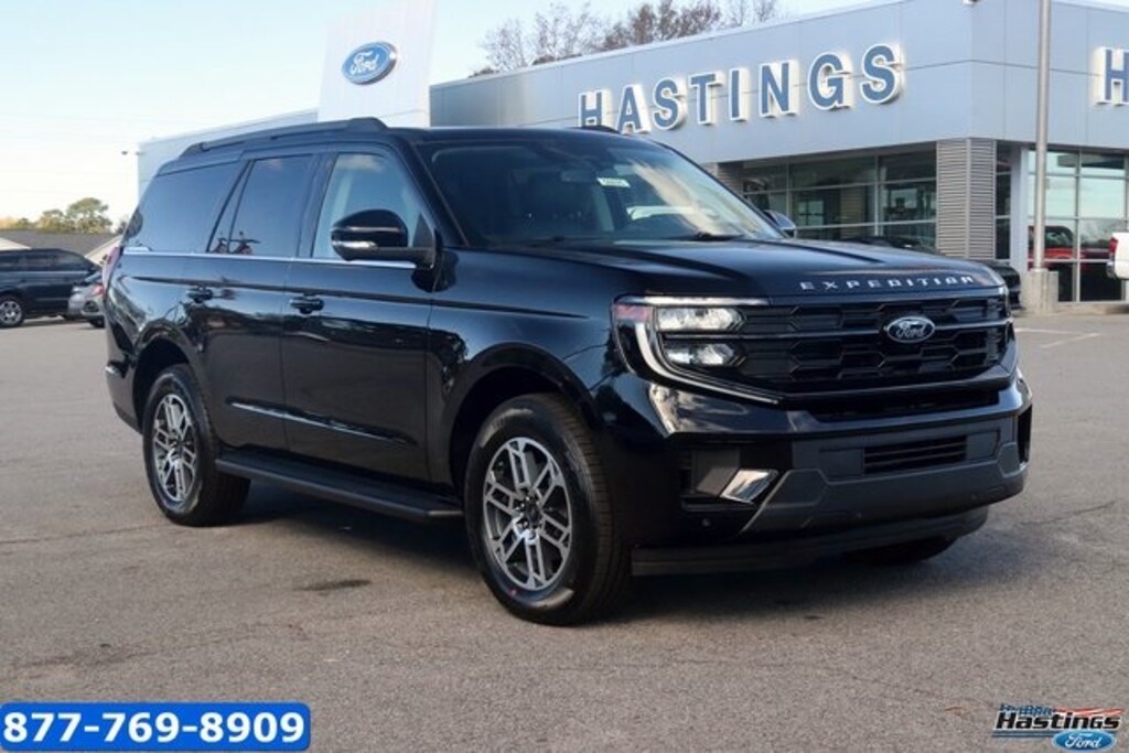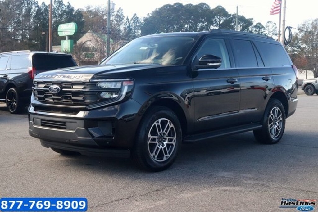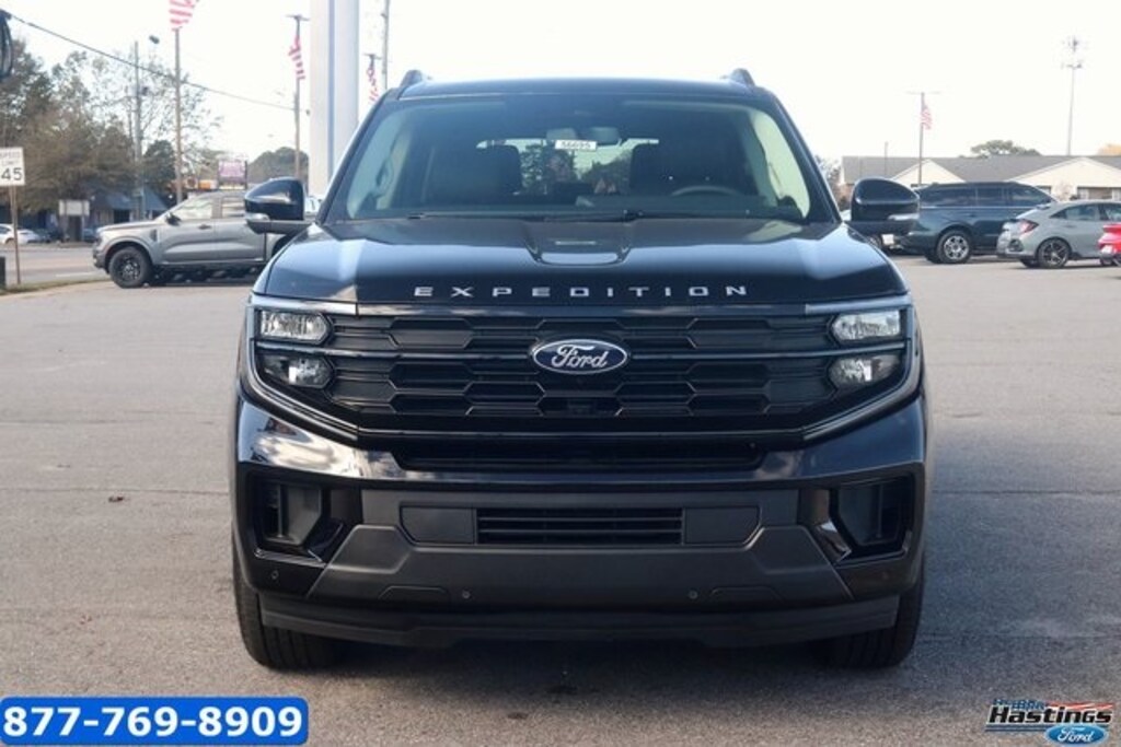 Agate Black Metallic 2025 Ford Expedition Active RWD 10-Speed Automatic EcoBoost 3.5L V6 GTDi DOHC 24V Twin Turbocharged 110V/400W AC Power Outlet, 2nd Row Power-Folding Captain's Chairs, 3.31 Axle Ratio, 360-Degree Zone Lighting, 3rd Row Flexible Seating, 3rd row seats: split-bench, 3rd Row Vinyl Seats, 4-Door Intelligent Access (Lock/Unlock), 4-Wheel Disc Brakes, 6 Speakers, ABS brakes, ActiveX Front Heated Captain's Chairs, Air Conditioning, Alloy wheels, AM/FM radio: SiriusXM with 360L, Apple CarPlay/Android Auto, Auto High-beam Headlights, Auto-dimming Rear-View mirror, Automatic temperature control, BlueCruise Equipped, Brake assist, Bumpers: body-color, Cloth Front Captain's Chairs, Compass, Delay-off headlights, Driver door bin, Driver State Detection, Driver vanity mirror, Dual front impact airbags, Dual front side impact airbags, Electronic Stability Control, Emergency communication system: 911 Assist, Equipment Group 202A High Package, Exterior Parking Camera Rear, Flex Powered Console, Ford Split Gate, Four wheel independent suspension, Front anti-roll bar, Front Bucket Seats, Front Center Armrest, Front dual zone A/C, Front reading lights, Front Side Laminated Glass, Fully automatic headlights, Heated door mirrors, Heated Steering Wheel, Illuminated entry, Intersection Assist, Low tire pressure warning, Memory Driver Seat, Navigation System, Occupant sensing airbag, Outside temperature display, Overhead airbag, Overhead console, Panic alarm, Passenger door bin, Passenger vanity mirror, Power door mirrors, Power driver seat, Power Panoramic Vista Roof w/Power Sunshade, Power passenger seat, Power steering, Power Tilt/Telescopic Steering Wheel w/Memory, Power windows, Power-Folding Sideview Mirrors w/Autofold, Radio data system, Radio: AM/FM Stereo w/MP3 Capable, Rain Sensing Wipers, Rear air conditioning, Rear anti-roll bar, Rear reading lights, Rear window defroster, Rear window wiper, Reclining 3rd row seat, Remote keyless entry, SecuriCode Keyless Entry Pad, Security system, SiriusXM w/360L, Speed control, Speed-sensing steering, Speed-Sensitive Wipers, Split folding rear seat, Spoiler, Steering wheel mounted audio controls, Tachometer, Telescoping steering wheel, Tilt steering wheel, Traction control, Trip computer, Universal Garage Door Opener, USB Ports, Variably intermittent wipers, Voltmeter, Wheels: 18" Dark Alloy Painted Aluminum, Wheels: 20" Carbonized Gray Bright Machined Aluminum, Wireless Charging Pad.