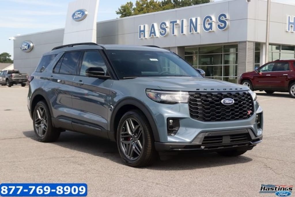 Vapor Blue Metallic 2025 Ford Explorer ST 4WD 10-Speed Automatic 3.0L EcoBoost V6 4WD, 10 Speakers, 3.58 Non-Limited Slip Rear Axle, 3rd row seats: bench, 4-Wheel Disc Brakes, ABS brakes, Air Conditioning, Alloy wheels, AM/FM radio: SiriusXM with 360L, Apple CarPlay/Android Auto, Auto High-beam Headlights, Auto-dimming door mirrors, Auto-dimming Rear-View mirror, Automatic temperature control, B&O Sound System by Bang & Olufsen, Brake assist, Bumpers: body-color, Compass, Delay-off headlights, Driver door bin, Driver vanity mirror, Dual front impact airbags, Dual front side impact airbags, Electronic Stability Control, Emergency communication system: 911 Assist, Equipment Group 400A Standard Package, Exterior Parking Camera Rear, Four wheel independent suspension, Front anti-roll bar, Front Bucket Seats, Front Center Armrest, Front dual zone A/C, Front fog lights, Front reading lights, Fully automatic headlights, Garage door transmitter, Heated door mirrors, Heated front seats, Heated rear seats, Heated steering wheel, Heated/Ventilated Miko Sport Captain's Chairs, Illuminated entry, Knee airbag, Leather steering wheel, Low tire pressure warning, Memory seat, Multicontour Seats w/Front Active Motion, Navigation System, Occupant sensing airbag, Outside temperature display, Overhead airbag, Overhead console, Panic alarm, Panoramic Vista Roof w/Power Shade, Passenger door bin, Passenger vanity mirror, Power door mirrors, Power driver seat, Power Liftgate, Power passenger seat, Power steering, Power windows, Radio: B&O Sound System by Bang & Olufsen, Rain sensing wipers, Rear air conditioning, Rear anti-roll bar, Rear reading lights, Rear window defroster, Rear window wiper, Remote keyless entry, Security system, Speed control, Speed-sensing steering, Speed-Sensitive Wipers, Split folding rear seat, Spoiler, Sport steering wheel, Steering wheel mounted audio controls, Sun and Sound Package, Tachometer, Telescoping steering wheel, Tilt steering wheel, Traction control, Trip computer, Turn signal indicator mirrors, Variably intermittent wipers, Ventilated front seats, Wheels: 21" Magnetite-Painted Aluminum, 4WD. Price includes: $1500 - Bonus Customer Cash. Exp. 01/05/2026