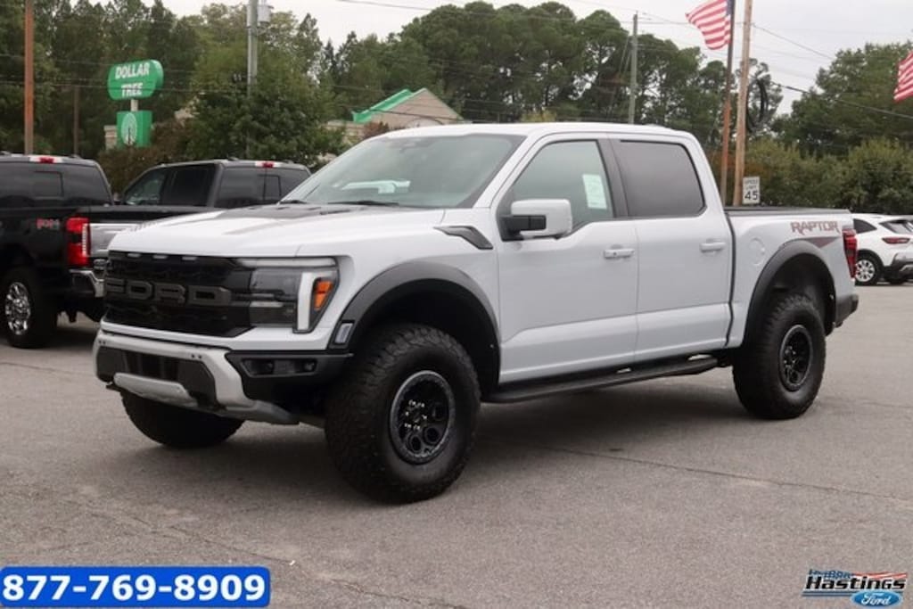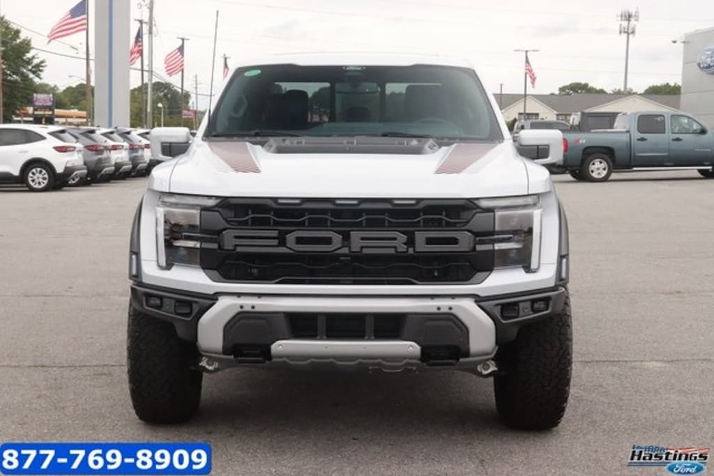 Space White Metallic 2025 Ford F-150 Raptor 4WD 10-Speed Automatic 3.5L V6 EcoBoost 4WD, 14 Speakers, 17" Cast Aluminum Wheels, 4-Wheel Disc Brakes, ABS brakes, Adjustable pedals, Air Conditioning, Alloy wheels, AM/FM radio: SiriusXM with 360L, Auto High-beam Headlights, Auto tilt-away steering wheel, Auto-dimming door mirrors, Auto-dimming Rear-View mirror, Automatic temperature control, Brake assist, Bumpers: body-color, Carbon Fiber Interior Appliques, Compass, Delay-off headlights, Driver door bin, Driver vanity mirror, Dual front impact airbags, Dual front side impact airbags, Dual Valve Shocks, Electronic Locking w/4.10 Axle Ratio, Electronic Stability Control, Emergency communication system: SYNC 4 911 Assist, Equipment Group 802A Raptor 37, Front anti-roll bar, Front Bucket Seats, Front Center Armrest, Front dual zone A/C, Front fog lights, Front reading lights, Front wheel independent suspension, Fully automatic headlights, Garage door transmitter, Heads-Up Display, Heated door mirrors, Heated front seats, Heated rear seats, Heated steering wheel, Illuminated entry, Lane Departure Warning System, Leather steering wheel, Leather Trimmed Seats, Low tire pressure warning, Memory seat, Modular Front Bumper, Navigation system: Connected Navigation, Occupant sensing airbag, Outside temperature display, Overhead airbag, Overhead console, Panic alarm, Passenger door bin, Passenger vanity mirror, Pedal memory, Power door mirrors, Power driver seat, Power passenger seat, Power steering, Power windows, Radio data system, Radio: B&O Unleashed Sound System by Bang & Olufsen, Rain sensing wipers, Rear reading lights, Rear step bumper, Rear window defroster, RECARO Alcantara Suede Front Seats, Remote keyless entry, Security system, Speed control, Speed-sensing steering, Split folding rear seat, Steering wheel memory, Steering wheel mounted audio controls, SYNC 4 w/Enhanced Voice Recognition, Tachometer, Telescoping steering wheel, Tilt steering wheel, Tough Bed Spray-In Bedliner, Traction control, Trip computer, Turn signal indicator mirrors, Twin Panel Moonroof, Variably intermittent wipers, Ventilated front seats, Wheels: Raptor 37 Unique 17" Cast Aluminum, 4WD.