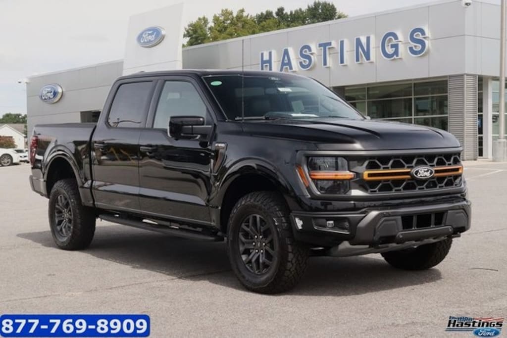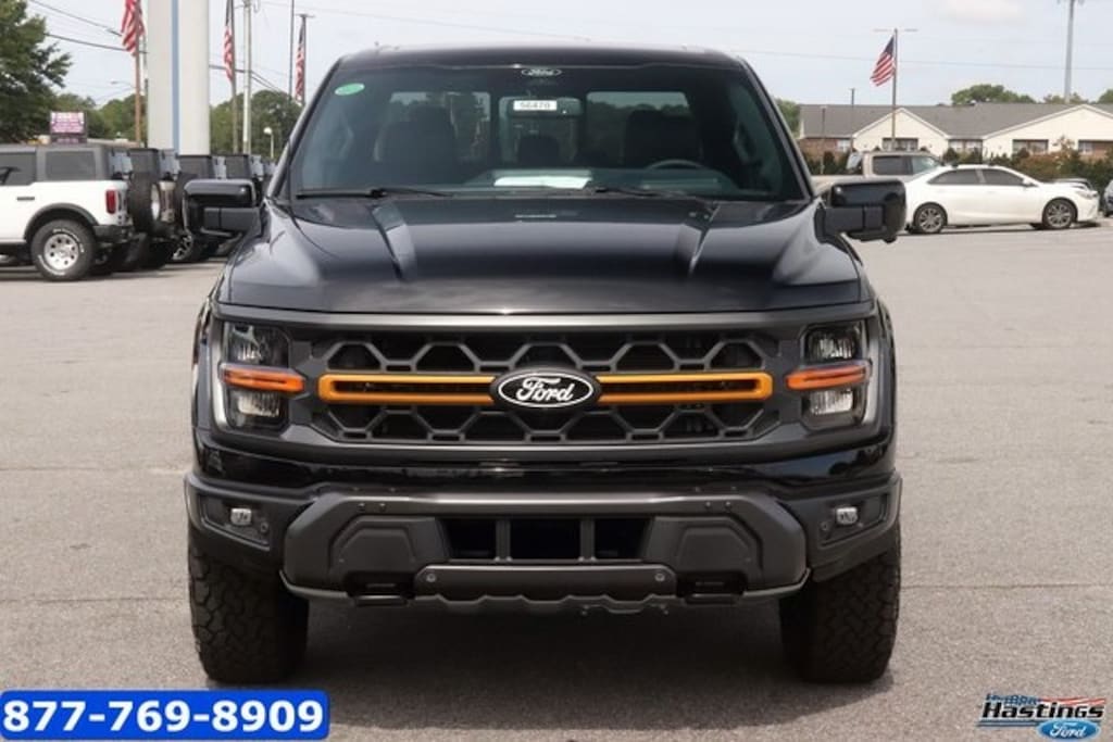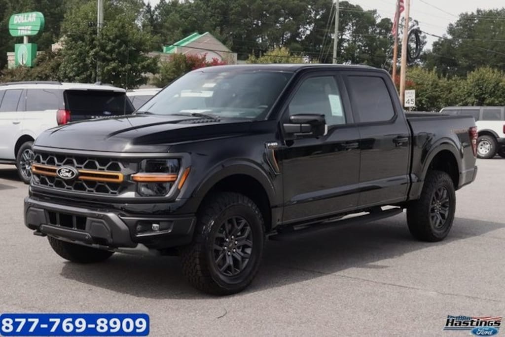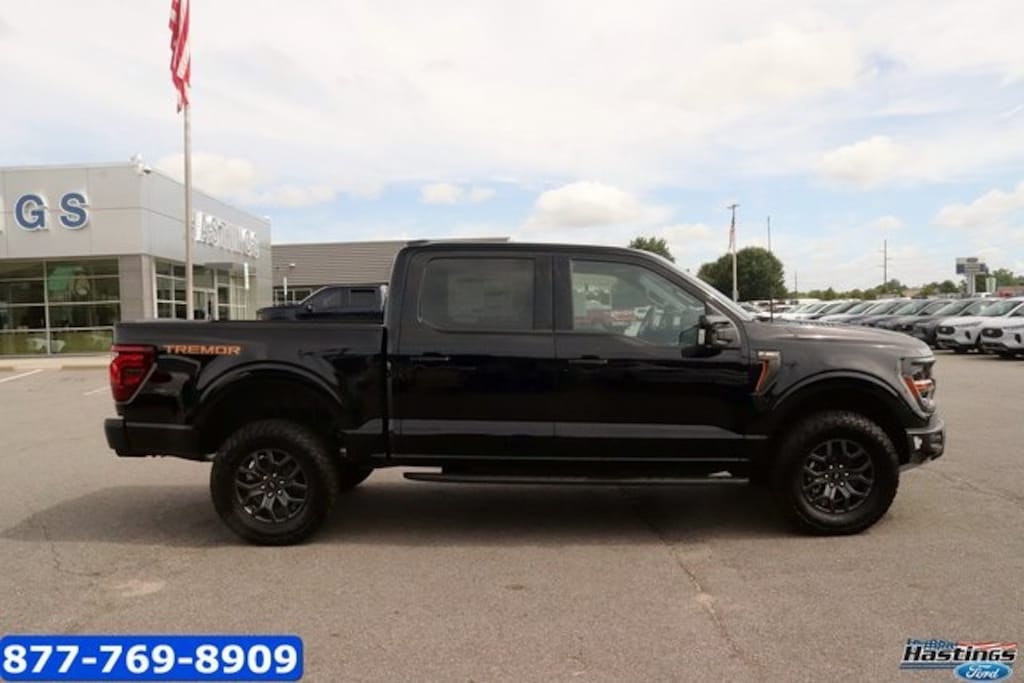 Agate Black Metallic 2025 Ford F-150 Tremor 4WD 10-Speed Automatic 5.0L V8 4WD, 4-Wheel Disc Brakes, 8 Speakers, ABS brakes, Adjustable pedals, Air Conditioning, Alloy wheels, AM/FM radio: SiriusXM with 360L, Auto High-beam Headlights, Auto-dimming door mirrors, Auto-dimming Rear-View mirror, Automatic temperature control, Brake assist, Bumpers: body-color, Compass, Delay-off headlights, Driver door bin, Driver vanity mirror, Dual front impact airbags, Dual front side impact airbags, Electronic Locking w/3.73 Axle Ratio, Electronic Stability Control, Emergency communication system: SYNC 4 911 Assist, Front anti-roll bar, Front Bucket Seats, Front Center Armrest, Front dual zone A/C, Front fog lights, Front reading lights, Front wheel independent suspension, Fully automatic headlights, GVWR: 7,100 lbs Payload Package, Heated door mirrors, Heated front seats, Illuminated entry, Low tire pressure warning, Navigation system: Connected Navigation, Occupant sensing airbag, Outside temperature display, Overhead airbag, Overhead console, Panic alarm, Passenger door bin, Passenger vanity mirror, Power door mirrors, Power driver seat, Power passenger seat, Power steering, Power windows, Radio data system, Radio: B&O Sound System by Bang & Olufsen, Rear reading lights, Rear step bumper, Rear window defroster, Remote keyless entry, Security system, Speed control, Split folding rear seat, Steering wheel mounted audio controls, SYNC 4 w/Enhanced Voice Recognition, Tachometer, Telescoping steering wheel, Tilt steering wheel, Traction control, Trip computer, Turn signal indicator mirrors, Unique Sport Cloth 40/Console/40 Power Front Seat, Variably intermittent wipers, Voltmeter, Wheels: 18" Alloy w/Dark Matte Finish, 4WD.