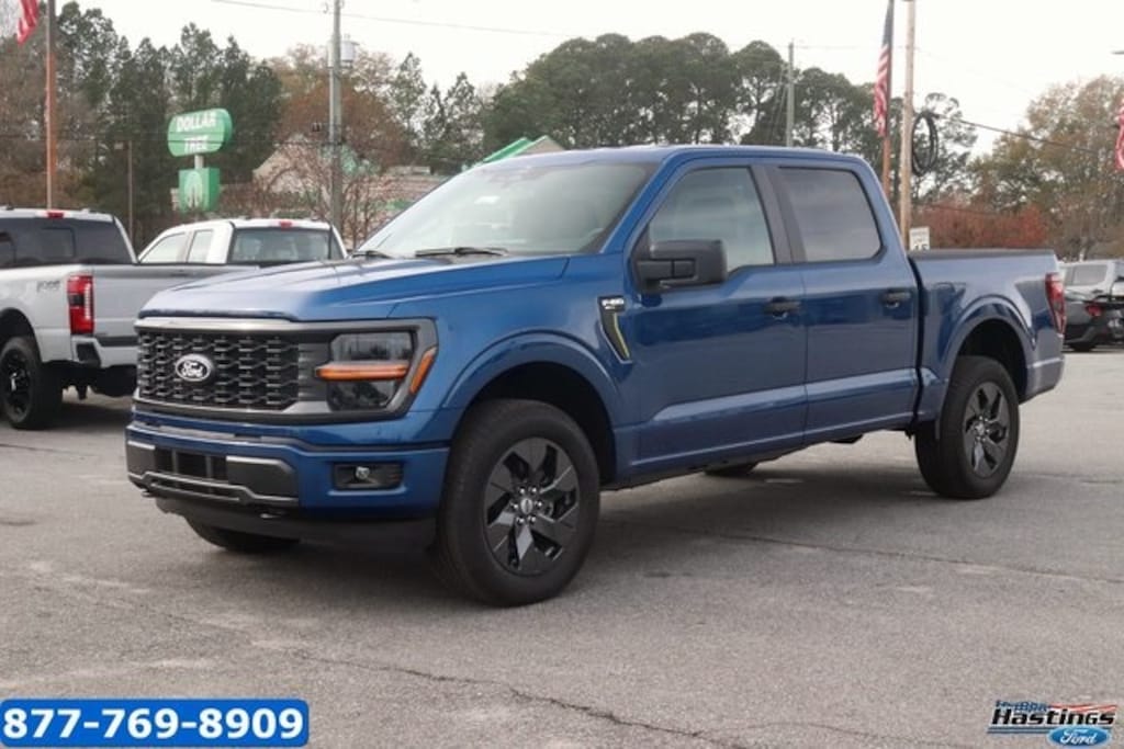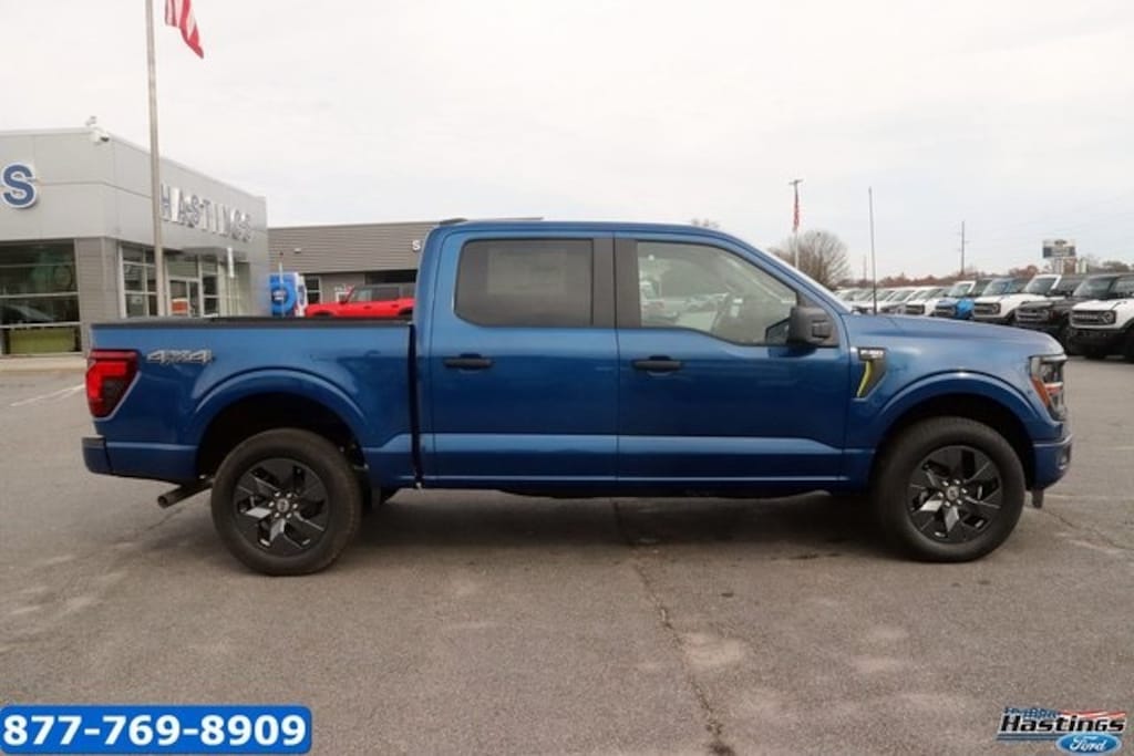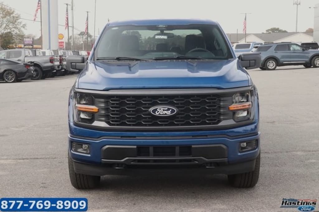 Atlas Blue Metallic 2025 Ford F-150 STX 4WD 10-Speed Automatic 2.7L V6 EcoBoost 4WD, 3.55 Axle Ratio, 4-Wheel Disc Brakes, 6 Speakers, ABS brakes, Air Conditioning, Alloy wheels, AM/FM radio: SiriusXM with 360L, Auto High-beam Headlights, Brake assist, Bumpers: body-color, Compass, Delay-off headlights, Driver door bin, Dual front impact airbags, Dual front side impact airbags, Electronic Stability Control, Emergency communication system: SYNC 4 911 Assist, Front anti-roll bar, Front Bucket Seats, Front Center Armrest, Front reading lights, Front wheel independent suspension, Fully automatic headlights, GVWR: 6,650 lbs Payload Package, Heated door mirrors, Illuminated entry, Internet access capable: FordPass Connect 5G, Low tire pressure warning, Occupant sensing airbag, Outside temperature display, Overhead airbag, Overhead console, Panic alarm, Passenger door bin, Passenger vanity mirror, Power door mirrors, Power steering, Power windows, Radio data system, Radio: AM/FM Stereo w/SiriusXM 360L, Rear Parking Sensors, Rear step bumper, Rear window defroster, Remote keyless entry, Security system, Speed control, Split folding rear seat, Steering wheel mounted audio controls, SYNC 4 w/Enhanced Voice Recognition, Tachometer, Telescoping steering wheel, Tilt steering wheel, Traction control, Trip computer, Variably intermittent wipers, Voltmeter, Wheels: 18" Gloss Black, 4WD.