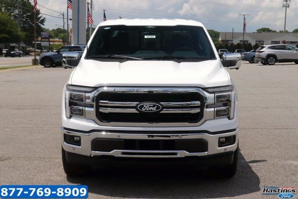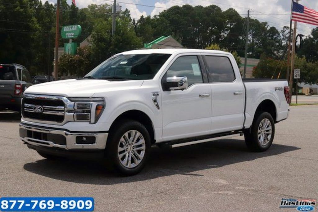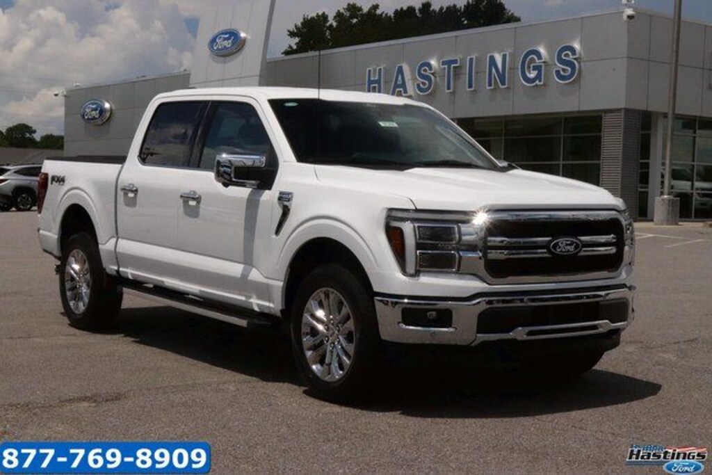 Oxford White 2025 Ford F-150 Lariat 4WD 10-Speed Automatic 3.5L V6 EcoBoost 4WD, 4-Wheel Disc Brakes, 4x4 FX4 Off-Road Bodyside Decal, 6" Angular Bright Anodized Step Bar, 8 Speakers, ABS brakes, ActiveX Trimmed Bucket Seats, Adjustable pedals, Air Conditioning, Alloy wheels, AM/FM radio: SiriusXM with 360L, Auto High-beam Headlights, Auto-dimming door mirrors, Auto-dimming Rear-View mirror, Automatic temperature control, Brake assist, Bumpers: chrome, Chrome wheels, Compass, Delay-off headlights, Driver door bin, Driver vanity mirror, Dual front impact airbags, Dual front side impact airbags, Electronic Stability Control, Emergency communication system: SYNC 4 911 Assist, Equipment Group 501A Mid, Front anti-roll bar, Front Bucket Seats, Front Center Armrest, Front dual zone A/C, Front fog lights, Front reading lights, Front wheel independent suspension, Fully automatic headlights, FX4 Off-Road Package, Garage door transmitter, Heated door mirrors, Heated front seats, Heated steering wheel, Hill Descent Control, Illuminated Driver & Passenger Visors, Illuminated entry, Internet access capable: FordPass Connect 5G, Low tire pressure warning, Memory seat, Monotube Rear Shocks, Navigation system: Connected Navigation, Occupant sensing airbag, Off-Road Tuned Front Shock Absorbers, Outside temperature display, Overhead airbag, Overhead console, Panic alarm, Passenger door bin, Passenger vanity mirror, Pedal memory, Power door mirrors, Power driver seat, Power passenger seat, Power steering, Power windows, Power-Sliding Rear Window, Radio data system, Radio: B&O Sound System by Bang & Olufsen, Rain sensing wipers, Rear reading lights, Rear seat center armrest, Rear step bumper, Rear window defroster, Remote keyless entry, Rock Crawl Mode, Security system, Speed control, Split folding rear seat, Steering wheel mounted audio controls, SYNC 4 w/Enhanced Voice Recognition, Tachometer, Telescoping steering wheel, Tilt steering wheel, Tow/Haul Package, Traction control, Tray Style Floor Liner w/o Carpet Mats, Trip computer, Turn signal indicator mirrors, Variably intermittent wipers, Ventilated front seats, Voltmeter, Wheels: 18" Chrome-Like PVD, Wheels: 20" Chrome-Like PVD, 4WD. Price includes: $1000 - Truck Month Retail Bonus Cash. Exp. 03/31/2026 $2000 - Retail Customer Cash. Exp. 03/31/2026 $500 - Retail Bonus Cash. Exp. 03/31/2026
