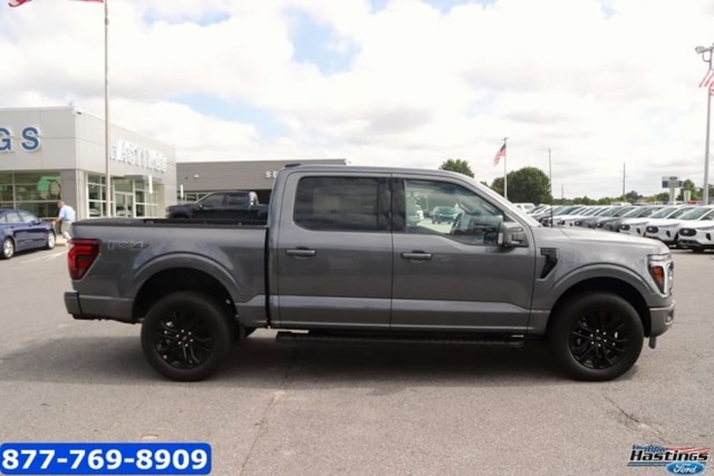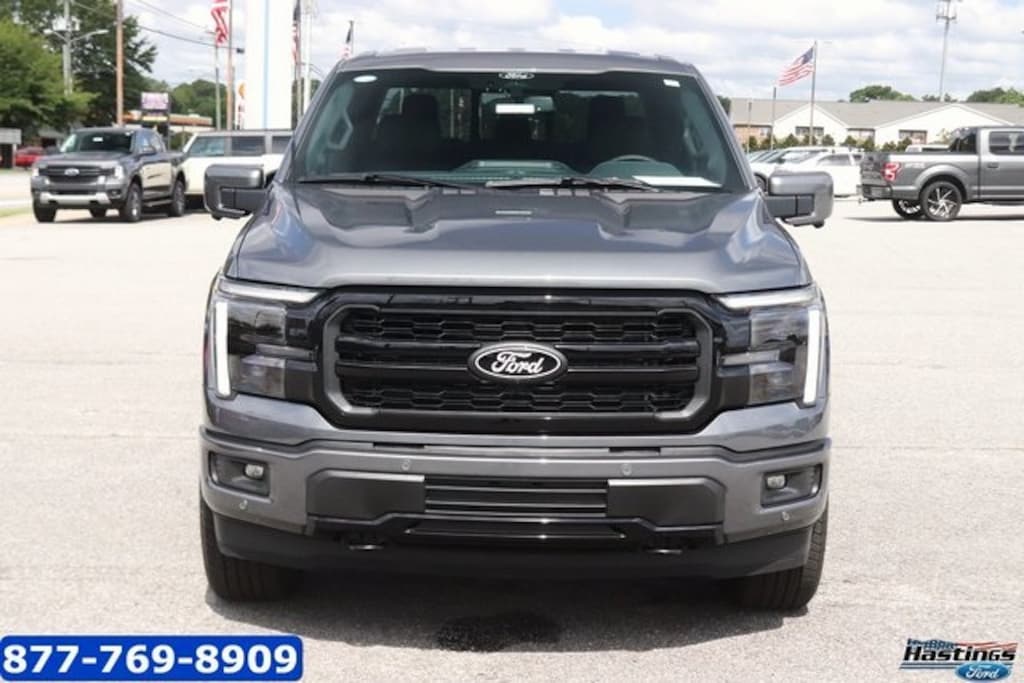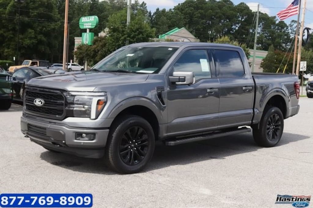 Carbonized Gray Metallic 2025 Ford F-150 Lariat 4WD 10-Speed Automatic 5.0L V8 4WD, 3.31 Axle Ratio, 4-Wheel Disc Brakes, 4x4 FX4 Off-Road Bodyside Decal, 8 Speakers, ABS brakes, ActiveX Trimmed Bucket Seats, Adjustable pedals, Air Conditioning, Alloy wheels, AM/FM radio: SiriusXM with 360L, Auto High-beam Headlights, Auto-dimming door mirrors, Auto-dimming Rear-View mirror, Automatic temperature control, Brake assist, Bumpers: chrome, Chrome wheels, Compass, Console Worksurface, Delay-off headlights, Driver door bin, Driver vanity mirror, Dual front impact airbags, Dual front side impact airbags, Electronic Stability Control, Emergency communication system: SYNC 4 911 Assist, Equipment Group 501A Mid, Front anti-roll bar, Front Bucket Seats, Front Center Armrest, Front dual zone A/C, Front fog lights, Front reading lights, Front wheel independent suspension, Fully automatic headlights, FX4 Off-Road Package, Garage door transmitter, Heated door mirrors, Heated front seats, Heated steering wheel, Hill Descent Control, Illuminated entry, Low tire pressure warning, Memory seat, Mobile Office Package, Monotube Rear Shocks, Navigation system: Connected Navigation, Occupant sensing airbag, Off-Road Tuned Front Shock Absorbers, Outside temperature display, Overhead airbag, Overhead console, Panic alarm, Partitioned Lockable Rear Storage, Passenger door bin, Passenger vanity mirror, Pedal memory, Power door mirrors, Power driver seat, Power passenger seat, Power steering, Power windows, Radio data system, Radio: B&O Sound System by Bang & Olufsen, Rain sensing wipers, Rear reading lights, Rear seat center armrest, Rear step bumper, Rear window defroster, Remote keyless entry, Rock Crawl Mode, Security system, Speed control, Split folding rear seat, Steering wheel mounted audio controls, SYNC 4 w/Enhanced Voice Recognition, Tachometer, Telescoping steering wheel, Tilt steering wheel, Tow/Haul Package, Traction control, Tray Style Floor Liner w/o Carpet Mats, Trip computer, Turn signal indicator mirrors, Variably intermittent wipers, Ventilated front seats, Voltmeter, Wheels: 18" Chrome-Like PVD, Wheels: 20" Chrome-Like PVD, Wireless Charging, 4WD.