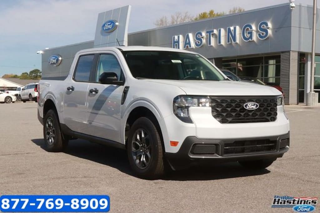 Space White Metallic 2025 Ford Maverick XLT FWD CVT 2.5L I-4 Hybrid 2.5L I-4 Hybrid, 2.91 Axle Ratio, 4-Wheel Disc Brakes, 400W Inverter w/USB Console Rear, 6 Speakers, ABS brakes, Air Conditioning, Alloy wheels, AM/FM radio: SiriusXM with 360L, Apple CarPlay/Android Auto, Auto High Beams, Auto High-beam Headlights, Automatic temperature control, Brake assist, Bumpers: body-color, Compass, Delay-off headlights, Driver door bin, Driver vanity mirror, Dual front impact airbags, Dual front side impact airbags, Electronic Stability Control, Emergency communication system: SYNC 4 911 Assist, Equipment Group 300A, Exterior Parking Camera Rear, Front anti-roll bar, Front Bucket Seats, Front Center Armrest, Front reading lights, Front wheel independent suspension, Fully automatic headlights, Heated Mirror w/Painted Black Skull Caps, Heated Seats, Illuminated entry, Internet access capable: FordPass Connect 5G, Knee airbag, LED Box Lighting, Low tire pressure warning, Occupant sensing airbag, Outside temperature display, Overhead airbag, Overhead console, Panic alarm, Passenger door bin, Passenger vanity mirror, Power door mirrors, Power steering, Power windows, Pre-Collision Assist w/Automatic Emergency Braking, Radio data system, Radio: AM/FM Stereo w/6 Speakers, Rear anti-roll bar, Rear seat center armrest, Rear step bumper, Rear-View Camera, Remote keyless entry, Remote Start System, Security system, SiriusXM w/360L, Soft Vinyl Wrapped Heated Steering Wheel, Speed control, Speed-sensing steering, Steering wheel mounted audio controls, SYNC 4 w/Enhanced Voice Recognition, Telescoping steering wheel, Tilt steering wheel, Traction control, Trip computer, Unique Cloth Front Bucket Seats, Wheels: 17" Carbonized Gray Painted Aluminum, XLT Luxury Package, 2.5L I-4 Hybrid.