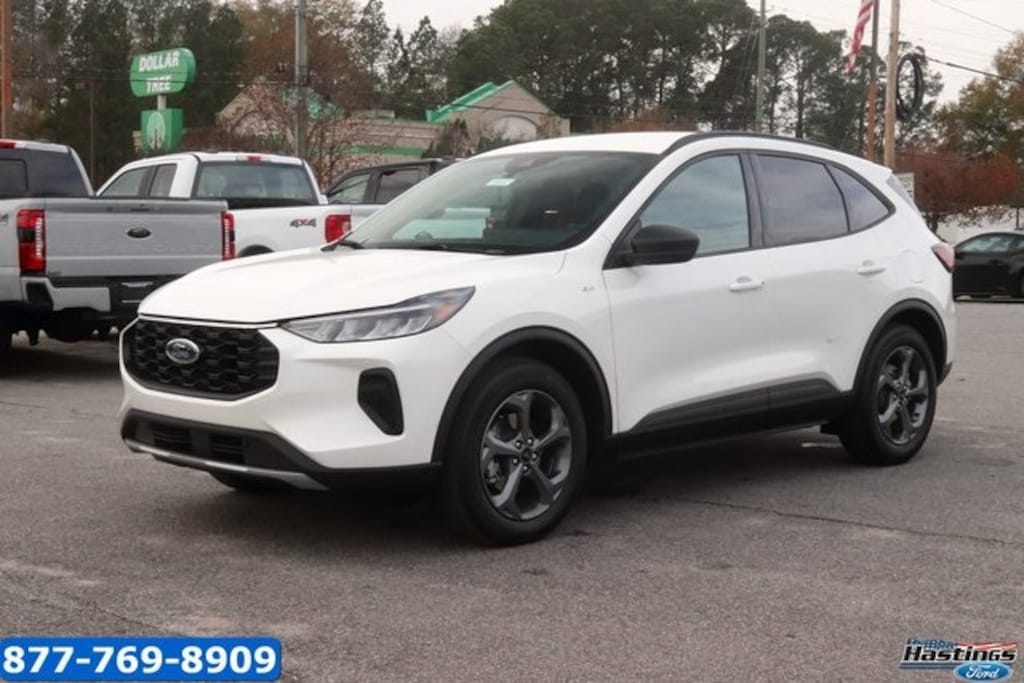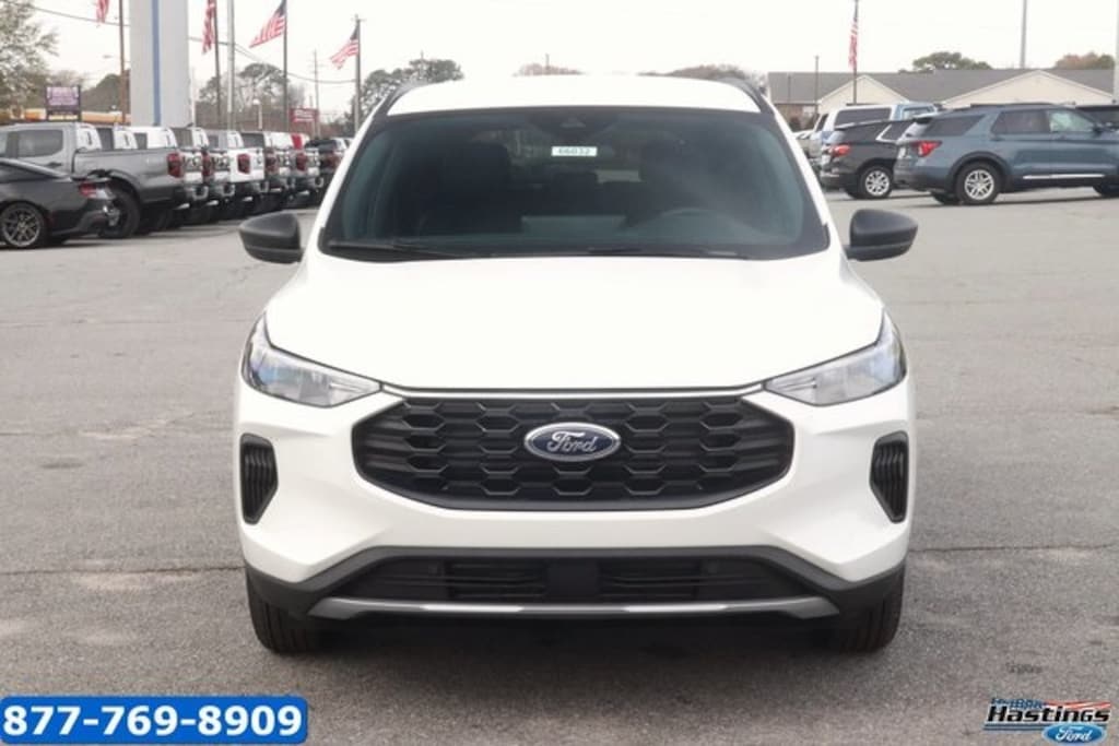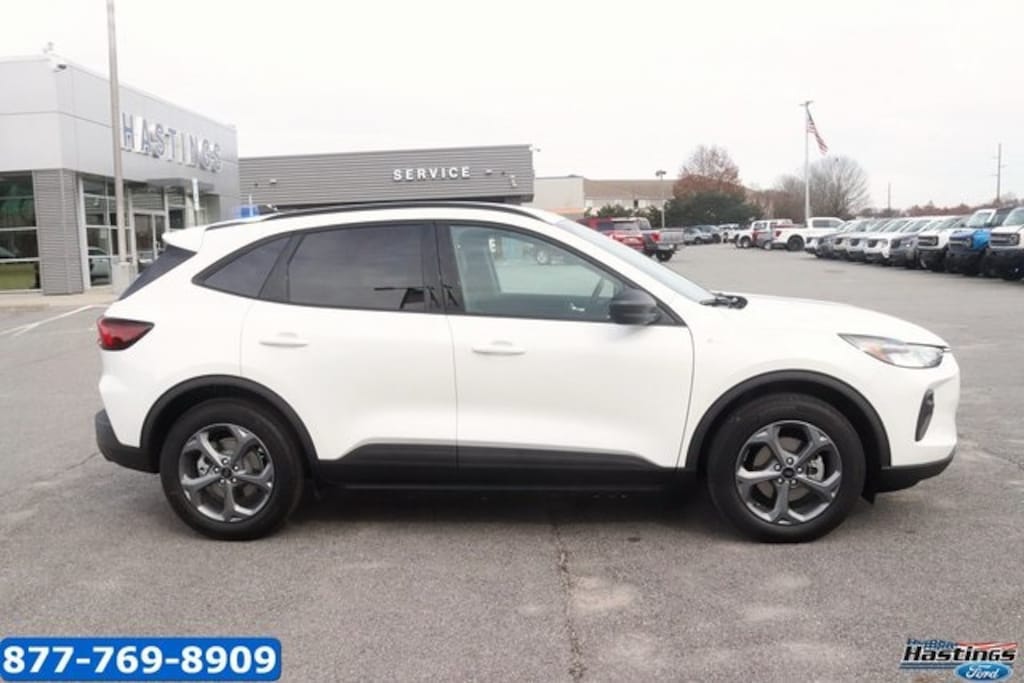 star white metallic tri-coat 2026 Ford Escape ST-Line FWD 8-Speed Automatic 1.5L EcoBoost 3.81 Axle Ratio, 4-Way Manual Front Passenger Seat, 4-Wheel Disc Brakes, 6 Speakers, 8-Way Power Driver Seat, ABS brakes, Adaptive Cruise Control with Stop-and-Go, Air Conditioning, Alloy wheels, AM/FM radio: SiriusXM 360L, Auto High-beam Headlights, Automatic temperature control, Brake assist, Bumpers: body-color, Cold Weather Package, Compass, Connected Navigation (1-Year Included), Delay-off headlights, Digital Rear View Camera, Driver door bin, Driver vanity mirror, Dual front impact airbags, Dual front side impact airbags, Electronic Stability Control, Emergency communication system: SYNC 4 911 Assist, Equipment Group 300A, Evasive Steering Assist, Ford App, Ford Co-Pilot360 Assist+, Four wheel independent suspension, Front anti-roll bar, Front Bucket Seats, Front Center Armrest, Front dual zone A/C, Front License Plate Bracket, Front reading lights, Fully automatic headlights, Heated Front Row Seats, Heated Sideview Mirrors, Heated Steering Wheel, Heated steering wheel, Illuminated entry, Intersection Assist, Knee airbag, Low tire pressure warning, Occupant sensing airbag, Outside temperature display, Overhead airbag, Overhead console, Panic alarm, Partial Vinyl/Cloth Front Sport Contour Bucket Seats with Red Stitching, Passenger door bin, Passenger vanity mirror, Power door mirrors, Power driver seat, Power Liftgate, Power steering, Power windows, Predictive Speed Assist, Radio data system, Radio: AM/FM Stereo with SiriusXM 360L, Rear anti-roll bar, Rear Parking Sensor, Rear reading lights, Rear seat center armrest, Rear window defroster, Rear window wiper, Remote keyless entry, Remote Starter System, Speed control, Speed-sensing steering, Speed-Sensitive Wipers, Split folding rear seat, Spoiler, Sport steering wheel, Steering wheel mounted audio controls, SYNC 4, SYNC 4 with Enhanced Voice Recognition, Tachometer, Tech Pack #1, Telescoping steering wheel, Tilt steering wheel, Traction control, Trip computer, Variably intermittent wipers, Wheels: 18" Rock Metallic Painted Aluminum.