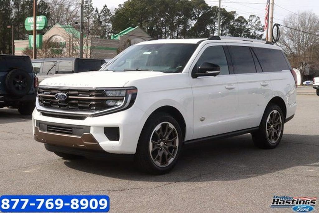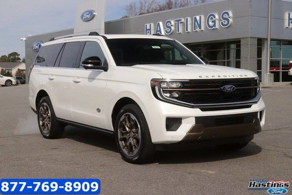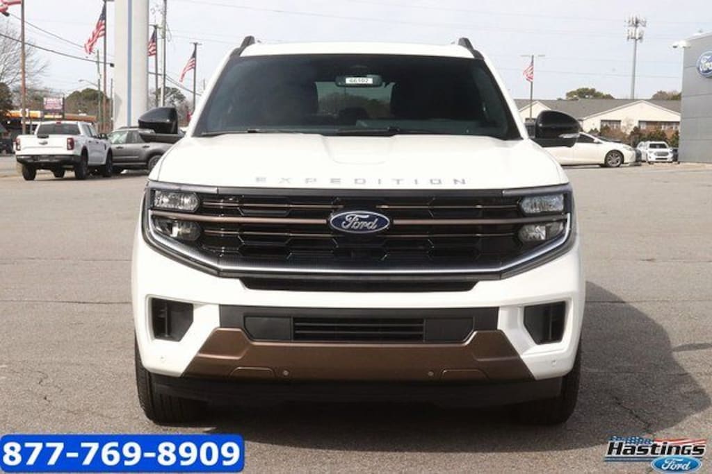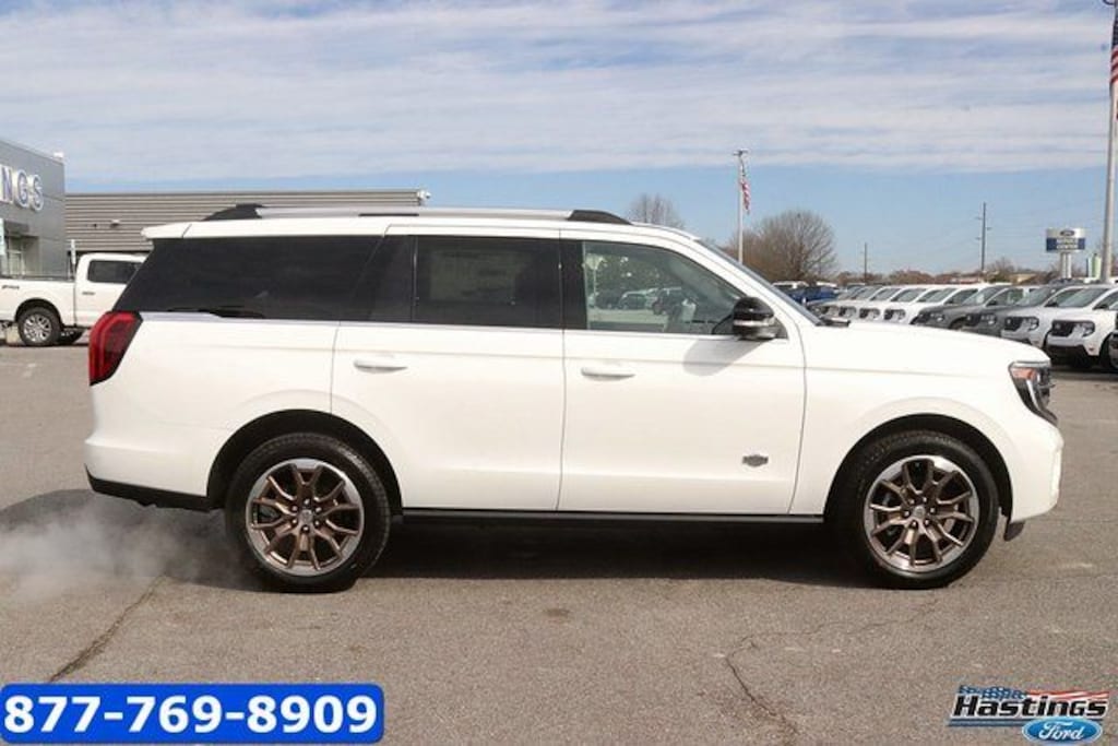 Star White Metallic Tri-Coat 2026 Ford Expedition King Ranch 4WD 10-Speed Automatic EcoBoost 3.5L V6 GTDi DOHC 24V Twin Turbocharged 4WD, 22 Speakers, 3.73 Axle Ratio, 3rd row seats: split-bench, 4-Wheel Disc Brakes, ABS brakes, Adaptive suspension, Adjustable pedals, Air Conditioning, Alloy wheels, AM/FM radio: SiriusXM with 360L, Apple CarPlay/Android Auto, Auto High-beam Headlights, Auto-dimming door mirrors, Auto-dimming Rear-View mirror, Automatic temperature control, Brake assist, Bumpers: body-color, Compass, Delay-off headlights, Digital Device Holder, Driver door bin, Driver vanity mirror, Dual front impact airbags, Dual front side impact airbags, Electronic Stability Control, Emergency communication system: 911 Assist, Equipment Group 400A, Exterior Parking Camera Rear, Ford Connectivity Package (1-Year Included), Ford Digital Experience, Four wheel independent suspension, Front anti-roll bar, Front Bucket Seats, Front Center Armrest, Front dual zone A/C, Front reading lights, Fully automatic headlights, Garage door transmitter, Genuine wood dashboard insert, Genuine wood door panel insert, Heated door mirrors, Heated front seats, Heated rear seats, Heated steering wheel, Heated/Ventilated Premium Del Rio Leather Front Captain's Chairs, Illuminated entry, Leather steering wheel, Low tire pressure warning, Memory seat, Navigation System, Occupant sensing airbag, Outside temperature display, Overhead airbag, Overhead console, Panic alarm, Passenger door bin, Passenger vanity mirror, Pedal memory, Power door mirrors, Power driver seat, Power moonroof: Vista Roof, Power passenger seat, Power steering, Power windows, Radio data system, Radio: B&O Unleashed Sound System by Bang & Olufsen, Rain sensing wipers, Rear air conditioning, Rear anti-roll bar, Rear reading lights, Rear window defroster, Rear window wiper, Reclining 3rd row seat, Remote keyless entry, Security system, SiriusXM with 360L, Speed control, Speed-sensing steering, Speed-Sensitive Wipers, Split folding rear seat, Spoiler, Steering wheel memory, Steering wheel mounted audio controls, Tachometer, Telescoping steering wheel, Tilt steering wheel, Traction control, Trip computer, Turn signal indicator mirrors, Variably intermittent wipers, Ventilated front seats, Voltmeter, Wheels: 22" x 9.0" Diamond Cut Machined Face Aluminum, 4WD.