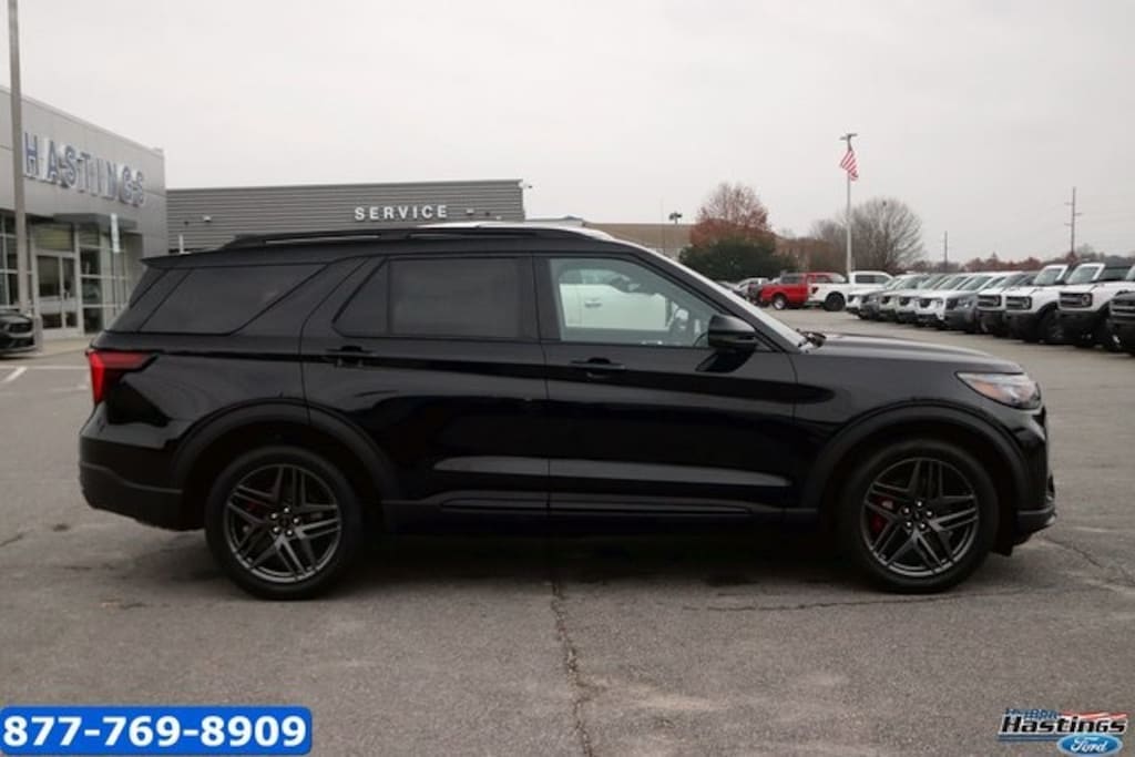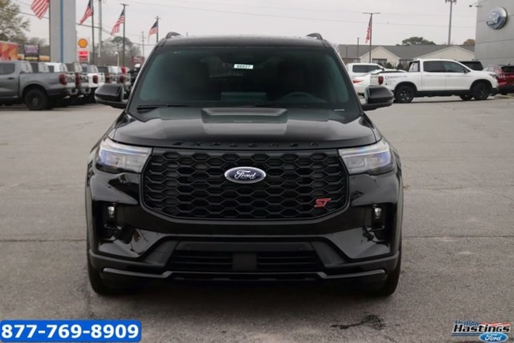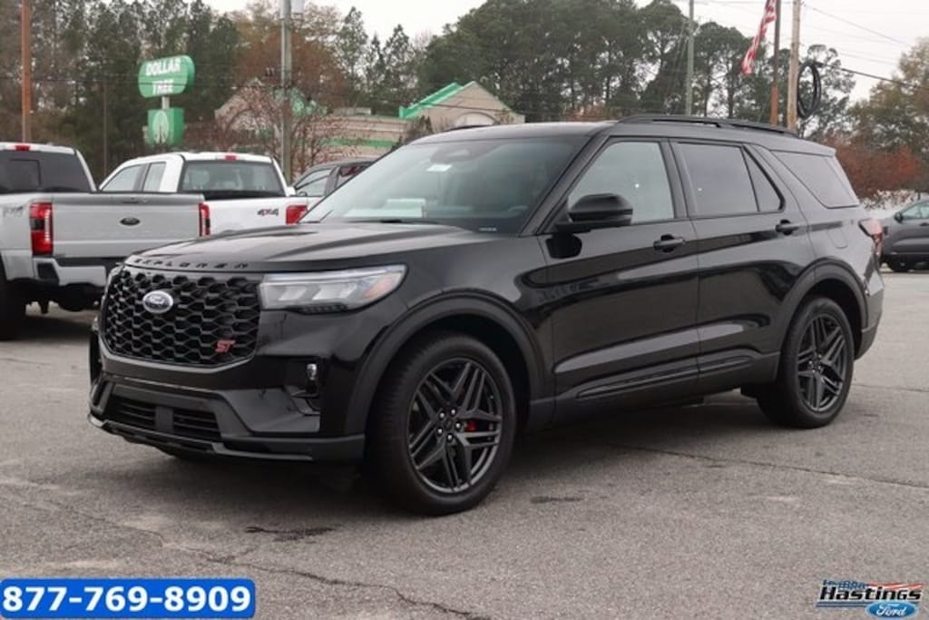 Agate Black Metallic 2026 Ford Explorer ST 4WD 10-Speed Automatic 3.0L EcoBoost V6 4WD, 10 Speakers, 3rd row seats: bench, 4-Wheel Disc Brakes, ABS brakes, Air Conditioning, Alloy wheels, AM/FM radio: SiriusXM with 360L, Apple CarPlay/Android Auto, Auto High-beam Headlights, Auto-dimming door mirrors, Auto-dimming Rear-View mirror, Automatic temperature control, Brake assist, Bumpers: body-color, Compass, Delay-off headlights, Driver door bin, Driver vanity mirror, Dual front impact airbags, Dual front side impact airbags, Electronic Stability Control, Emergency communication system: 911 Assist, Equipment Group 400A Standard Package, Exterior Parking Camera Rear, Four wheel independent suspension, Front anti-roll bar, Front Bucket Seats, Front Center Armrest, Front dual zone A/C, Front fog lights, Front reading lights, Fully automatic headlights, Garage door transmitter, Heated door mirrors, Heated front seats, Heated rear seats, Heated steering wheel, Heated/Ventilated Miko Captain's Chairs, Illuminated entry, Internet access capable: FordPass Connect 5G, Knee airbag, Leather steering wheel, Low tire pressure warning, Memory seat, Multicontour Seats with Front Active Motion, Navigation System, Occupant sensing airbag, Outside temperature display, Overhead airbag, Overhead console, Panic alarm, Panoramic Fixed Glass Roof with Power Shade, Passenger door bin, Passenger vanity mirror, Power door mirrors, Power driver seat, Power Liftgate, Power passenger seat, Power steering, Power windows, Radio: B&O Sound System by Bang & Olufsen, Radio: B&O Sound System by Bang and Olufsen, Rain sensing wipers, Rear air conditioning, Rear anti-roll bar, Rear reading lights, Rear window defroster, Rear window wiper, Remote Control Front Windows, Remote keyless entry, Security system, Speed control, Speed-sensing steering, Speed-Sensitive Wipers, Split folding rear seat, Spoiler, Sport steering wheel, Steering wheel mounted audio controls, Sun and Sound Package, Tachometer, Telescoping steering wheel, Tilt steering wheel, Traction control, Trip computer, Turn signal indicator mirrors, Variably intermittent wipers, Ventilated front seats, Wheels: 21" Magnetite-Painted Aluminum, 4WD. Price includes: $1000 - Retail Customer Cash. Exp. 01/05/2026 $500 - Bonus Customer Cash. Exp. 01/05/2026