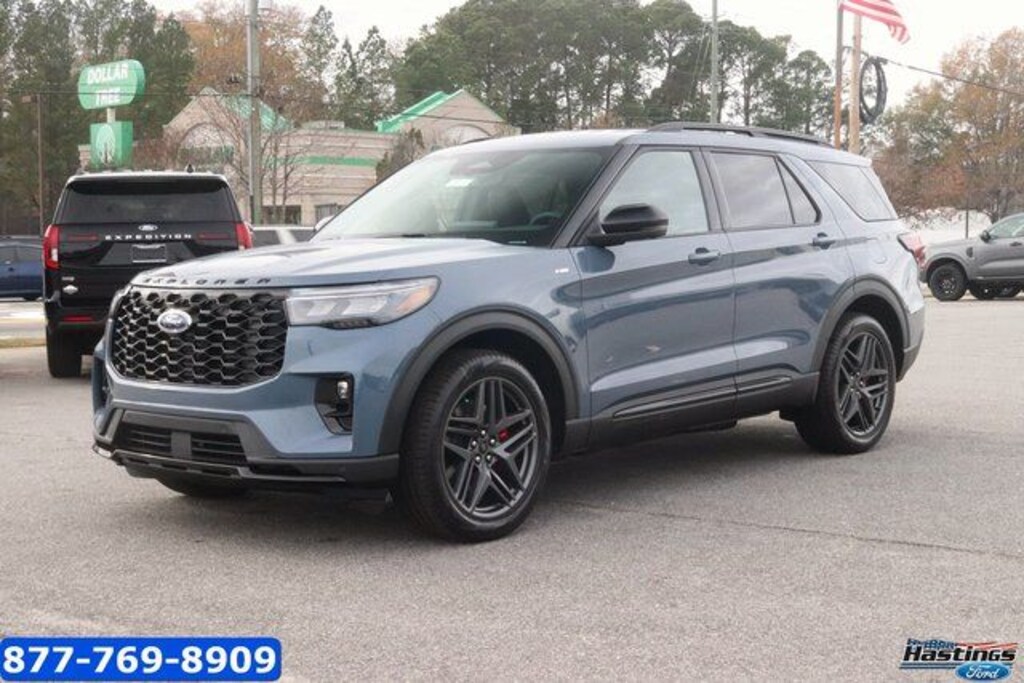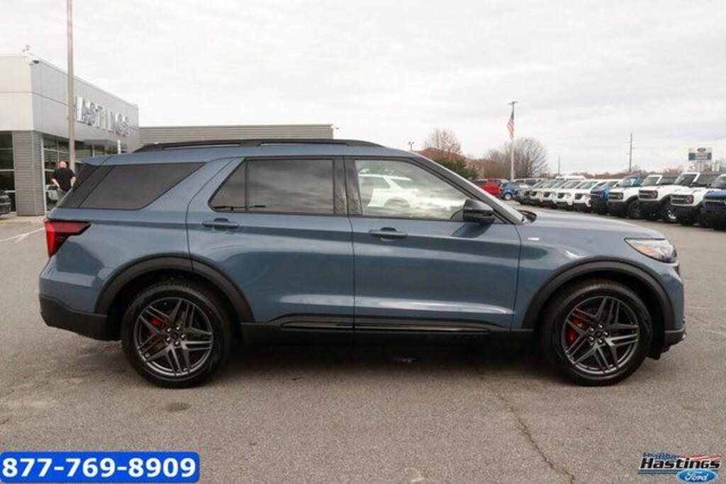 Vapor Blue Metallic 2026 Ford Explorer ST-Line RWD 10-Speed Automatic 2.3L EcoBoost I-4 10 Speakers, 110V/150W AC Power Outlet, 2nd Row Captain's Chairs w/E-Z Entry and Armrest, 2nd Row Heated Seats, 3rd row seats: bench, 4-Wheel Disc Brakes, ABS brakes, Air Conditioning, Alloy wheels, AM/FM radio: SiriusXM with 360L, Ambient Lighting, Apple CarPlay/Android Auto, Auto High-beam Headlights, Auto-Dimming Interior Rear-View Mirror, Automatic temperature control, Brake assist, Bumpers: body-color, Compass, Delay-off headlights, Driver door bin, Driver vanity mirror, Dual front impact airbags, Dual front side impact airbags, Electronic Stability Control, Emergency communication system: 911 Assist, Equipment Group 300A Standard Package, Exterior Parking Camera Rear, Four wheel independent suspension, Front anti-roll bar, Front Bucket Seats, Front Center Armrest, Front dual zone A/C, Front fog lights, Front reading lights, Fully automatic headlights, Garage door transmitter, Heated door mirrors, Heated front seats, Heated steering wheel, Heated Unique Cloth Captain's Chairs, Illuminated entry, Knee airbag, Leather steering wheel, Low tire pressure warning, Manual-Folding Sideview Mirrors, Memory Driver's Seat, Navigation System, Occupant sensing airbag, Outside temperature display, Overhead airbag, Overhead console, Panic alarm, Passenger door bin, Passenger vanity mirror, Performance Brakes, Power door mirrors, Power driver seat, Power Liftgate, Power passenger seat, Power steering, Power windows, Premium Package, Radio: B&O Sound System by Bang and Olufsen, Rain-Sensing Wipers (front Only), Rear air conditioning, Rear anti-roll bar, Rear reading lights, Rear window defroster, Rear window wiper, Red Painted Performance Front and Rear Brake Calipers, Remote keyless entry, Security system, Speed control, Speed-sensing steering, Speed-Sensitive Wipers, Split folding rear seat, Spoiler, ST-Line Street Pack, Steering wheel mounted audio controls, Tachometer, Telescoping steering wheel, Tilt steering wheel, Traction control, Trip computer, Variably intermittent wipers, Wheels: 20" Ebony-Painted Machined Aluminum, Wheels: 21" Magnetite-Painted Aluminum.
