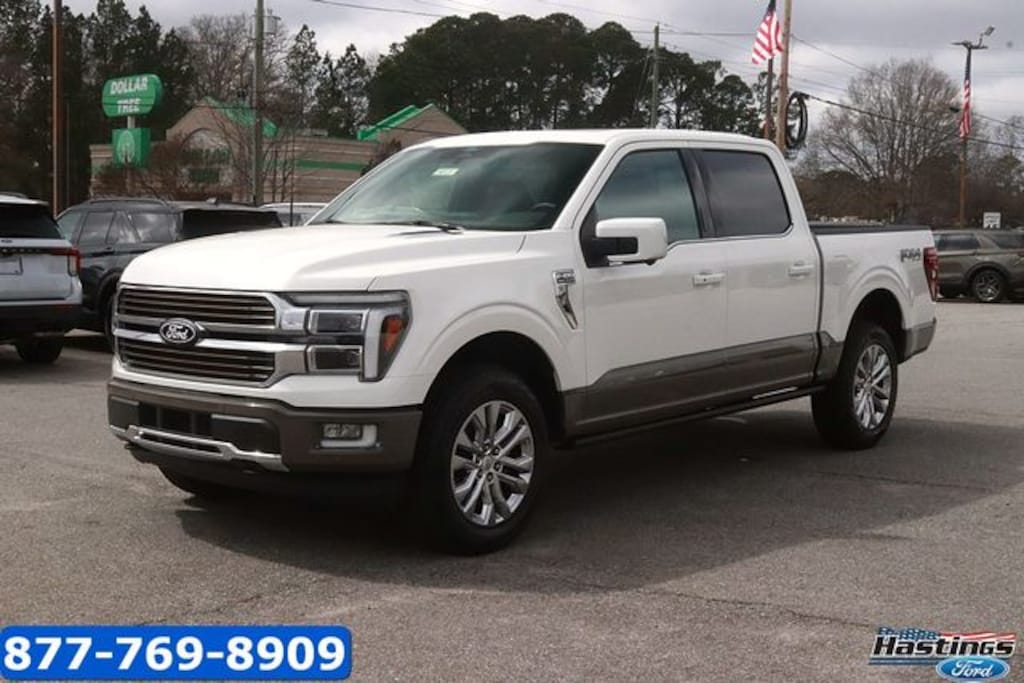 Star White Metallic Tri-Coat 2026 Ford F-150 King Ranch 4WD 10-Speed Automatic 3.5L V6 EcoBoost 4WD, 4-Wheel Disc Brakes, 4x4 FX4 Off-Road Bodyside Decal, 8 Speakers, ABS brakes, Adjustable pedals, Air Conditioning, Alloy wheels, AM/FM radio: SiriusXM with 360L, Auto High-beam Headlights, Auto tilt-away steering wheel, Auto-dimming door mirrors, Auto-dimming Rear-View mirror, Automatic temperature control, Brake assist, Chrome wheels, Compass, Delay-off headlights, Driver door bin, Driver vanity mirror, Driver's Side SecuriCode Keyless-Entry Keypad, Dual front impact airbags, Dual front side impact airbags, Electronic Locking with 3.55 Axle Ratio, Electronic Stability Control, Emergency communication system: SYNC 4 911 Assist, Equipment Group 601A High, Ford Connectivity Package (1-Year Included), Front anti-roll bar, Front Bucket Seats, Front Center Armrest, Front dual zone A/C, Front fog lights, Front License Plate Bracket, Front reading lights, Front wheel independent suspension, Fully automatic headlights, FX4 Off-Road Package, Garage door transmitter, Genuine wood dashboard insert, GVWR: 7,400 lbs Payload Package, Heated door mirrors, Heated front seats, Heated rear seats, Heated steering wheel, Hill Descent Control, Illuminated entry, Internet access capable: 5G Modem - Ford Connectivity Package, King Ranch Multicontour Leather Bucket Seats, Leather steering wheel, Low tire pressure warning, Memory seat, Monotube Rear Shocks, Navigation system: Connected Navigation, Occupant sensing airbag, Off-Road Tuned Front Shock Absorbers, Outside temperature display, Overhead airbag, Overhead console, Panic alarm, Passenger door bin, Passenger vanity mirror, Pedal memory, Power door mirrors, Power driver seat, Power passenger seat, Power steering, Power windows, Power-Deployable Running Boards, Pro Access Tailgate, Pro Power Onboard - 2KW, Radio data system, Radio: B&O Sound System by Bang and Olufsen, Radio: B&O Unleashed Sound System by Bang & Olufsen, Rain sensing wipers, Rear reading lights, Rear seat center armrest, Rear step bumper, Rear window defroster, Remote keyless entry, Security system, Speed control, Split folding rear seat, Steering wheel memory, Steering wheel mounted audio controls, SYNC 4 with Enhanced Voice Recognition, Tachometer, Telescoping steering wheel, Tilt steering wheel, Traction control, Trip computer, Turn signal indicator mirrors, Twin Panel Moonroof, Variably intermittent wipers, Ventilated front seats, Wheels: 20" Chrome-Like PVD, 4WD.