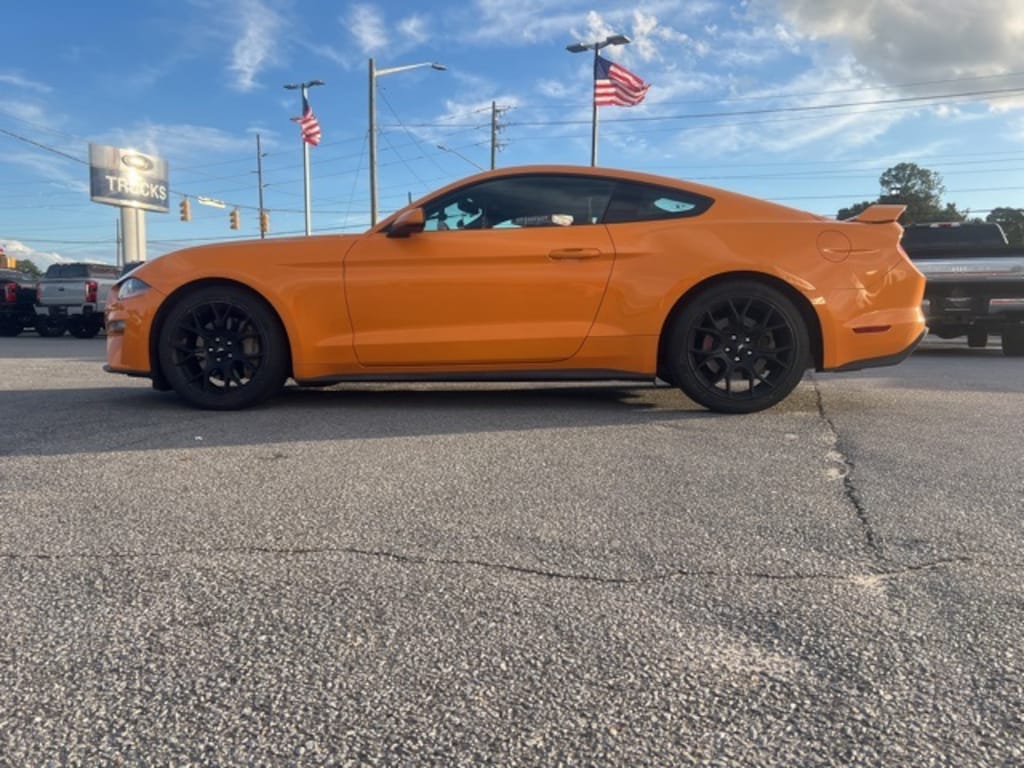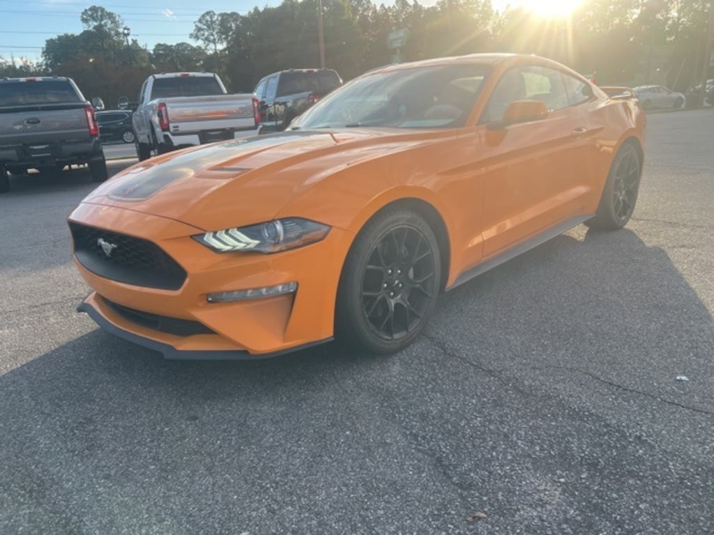 Orange 2018 Ford Mustang EcoBoost RWD 10-Speed Automatic EcoBoost 2.3L I4 GTDi DOHC Turbocharged VCT Mustang EcoBoost, 2D Coupe, EcoBoost 2.3L I4 GTDi DOHC Turbocharged VCT, 10-Speed Automatic, RWD, Orange, Ebony w/Cloth Bucket Seats, 3.55 TORSEN Limited Slip Rear Axle, EcoBoost Performance Package, Engine Spun Aluminum Instrument Panel, Equipment Group 100A, Gauge Pack (Oil Pressure & Boost), HD Front Springs, Larger Brake Rotors, Larger Radiator, Wheels: 19" x 9" Ebony Black-Painted Aluminum, 4-Wheel Disc Brakes, 6 Speakers, ABS brakes, Air Conditioning, Alloy wheels, AM/FM radio, AM/FM Stereo w/Single CD Player, Auto-dimming Rear-View mirror, Brake assist, Bumpers: body-color, CD player, Compass, Delay-off headlights, Driver door bin, Driver vanity mirror, Dual front impact airbags, Dual front side impact airbags, Electronic Stability Control, Emergency communication system: 911 Assist, Exterior Parking Camera Rear, Four wheel independent suspension, Front anti-roll bar, Front Bucket Seats, Front Center Armrest, Front reading lights, Fully automatic headlights, Illuminated entry, Knee airbag, Leather Shift Knob, Low tire pressure warning, Occupant sensing airbag, Outside temperature display, Overhead airbag, Overhead console, Panic alarm, Passenger door bin, Passenger vanity mirror, Power door mirrors, Power steering, Power windows, Radio data system, Rear anti-roll bar, Rear window defroster, Remote keyless entry, Security system, Speed control, Speed-sensing steering, Speed-Sensitive Wipers, Split folding rear seat, Steering wheel mounted audio controls, SYNC Communications & Entertainment System, Tachometer, Telescoping steering wheel, Tilt steering wheel, Traction control, Trip computer, Variably intermittent wipers, Voltmeter, Wheels: 17" Sparkle Silver-Painted Aluminum, Mustang EcoBoost, 2D Coupe, EcoBoost 2.3L I4 GTDi DOHC Turbocharged VCT, 10-Speed Automatic, RWD, Orange, Ebony w/Cloth Bucket Seats, 3.55 TORSEN Limited Slip Rear Axle, EcoBoost Performance Package, Engine Spun Aluminum Instrument Panel, Equipment Group 100A, Gauge Pack (Oil Pressure & Boost), HD Front Springs, Larger Brake Rotors, Larger Radiator, Wheels: 19" x 9" Ebony Black-Painted Aluminum.