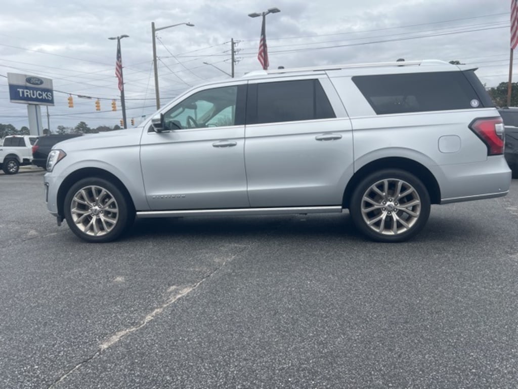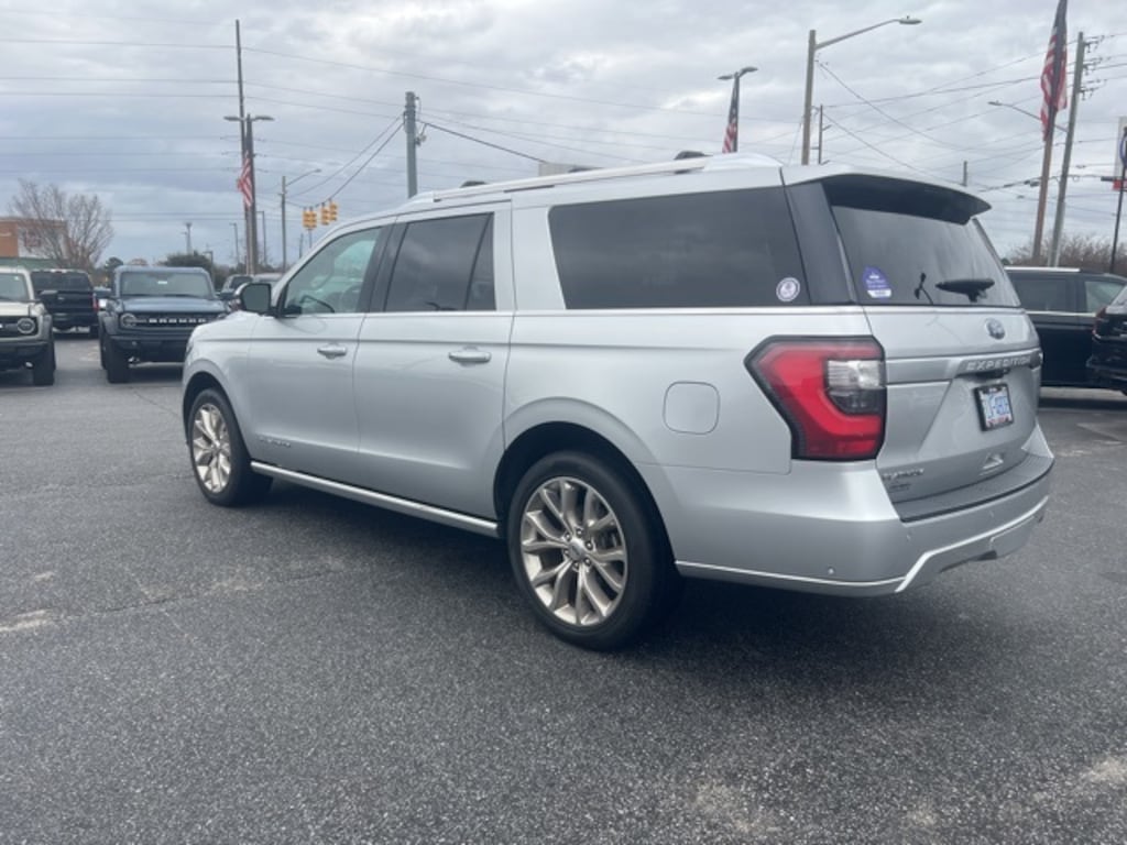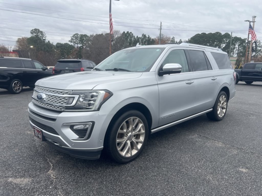 Ingot Silver 2019 Ford Expedition Max Platinum 4WD 10-Speed Automatic EcoBoost 3.5L V6 GTDi DOHC 24V Twin Turbocharged 12 Speakers, 1st & 2nd Row Floor Liners, 22" Polished Aluminum Wheels, 3.31 Axle Ratio, 3rd row seats: split-bench, 4-Wheel Disc Brakes, ABS brakes, Adaptive suspension, Adjustable pedals, Air Conditioning, Alloy wheels, AM/FM radio: SiriusXM, AppLink/Apple CarPlay and Android Auto, Auto High-beam Headlights, Auto-dimming door mirrors, Auto-dimming Rear-View mirror, Automatic temperature control, Brake assist, Bumpers: body-color, Compass, Delay-off headlights, Driver door bin, Driver vanity mirror, Dual front impact airbags, Dual front side impact airbags, Dual-Headrest Rear-Seat Entertainment System, Electronic Stability Control, Emergency communication system: SYNC 3 911 Assist, Equipment Group 600A, Exterior Parking Camera Rear, Four wheel independent suspension, Front anti-roll bar, Front Bucket Seats, Front Center Armrest, Front dual zone A/C, Front fog lights, Front reading lights, Fully automatic headlights, Garage door transmitter, Genuine wood console insert, Genuine wood dashboard insert, Genuine wood door panel insert, Heated & Cooled Perforated Leather Fr Bucket Seats, Heated door mirrors, Heated front seats, Heated rear seats, Heated steering wheel, Illuminated entry, Lane Departure Warning System, Leather steering wheel, License Plate Bracket, Low tire pressure warning, Memory seat, Navigation System, Occupant sensing airbag, Outside temperature display, Overhead airbag, Overhead console, Panic alarm, Passenger door bin, Passenger vanity mirror, Pedal memory, Power door mirrors, Power driver seat, Power Liftgate, Power moonroof, Power passenger seat, Power steering, Power windows, Radio data system, Radio: B&O Sound System by Bang & Olufsen, Rain sensing wipers, Rear air conditioning, Rear anti-roll bar, Rear audio controls, Rear reading lights, Rear window defroster, Rear window wiper, Reclining 3rd row seat, Remote keyless entry, Roof rack, Security system, SiriusXM Satellite Radio, Speed control, Speed-sensing steering, Speed-Sensitive Wipers, Split folding rear seat, Steering wheel memory, Steering wheel mounted audio controls, SYNC 3 Communications & Entertainment System, Tachometer, Telescoping steering wheel, Tilt steering wheel, Traction control, Trip computer, Turn signal indicator mirrors, Variably intermittent wipers, Ventilated front seats, Voltmeter.