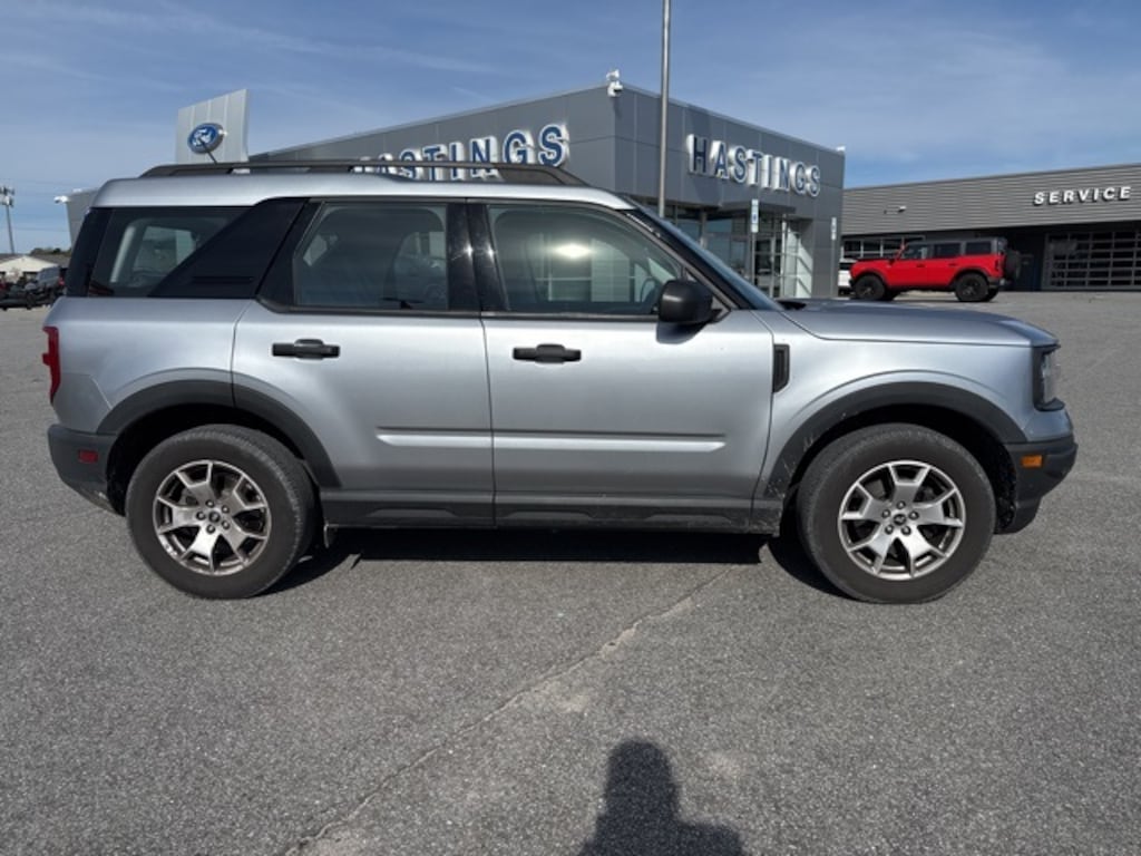 Silver 2021 Ford Bronco Sport 4WD 8-Speed Automatic 1.5L EcoBoost 3.80 Axle Ratio, 4-Wheel Disc Brakes, 6 Speakers, ABS brakes, Air Conditioning, Alloy wheels, AM/FM radio, AM/FM Stereo, Auto High-beam Headlights, Brake assist, Cloth Front Bucket Seats, Compass, Delay-off headlights, Driver door bin, Driver vanity mirror, Dual front impact airbags, Dual front side impact airbags, Electronic Stability Control, Emergency communication system: SYNC 3 911 Assist, Equipment Group 100A, Exterior Parking Camera Rear, Four wheel independent suspension, Front anti-roll bar, Front Bucket Seats, Front Center Armrest, Front License Plate Bracket, Front reading lights, Fully automatic headlights, Illuminated entry, Knee airbag, Low tire pressure warning, Occupant sensing airbag, Outside temperature display, Overhead airbag, Overhead console, Panic alarm, Passenger door bin, Passenger vanity mirror, Power door mirrors, Power steering, Power windows, Radio data system, Rear anti-roll bar, Rear reading lights, Rear window defroster, Rear window wiper, Remote keyless entry, Roof rack: rails only, Security system, Speed control, Speed-sensing steering, Speed-Sensitive Wipers, Split folding rear seat, Steering wheel mounted audio controls, SYNC 3 Communications & Entertainment System, SYNC 3/Apple CarPlay/Android Auto, Tachometer, Telescoping steering wheel, Tilt steering wheel, Traction control, Trip computer, Variably intermittent wipers, Wheels: 17" Sparkle Silver.