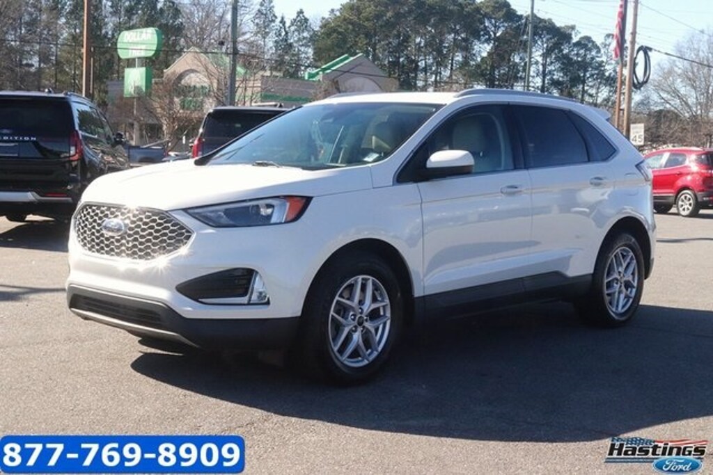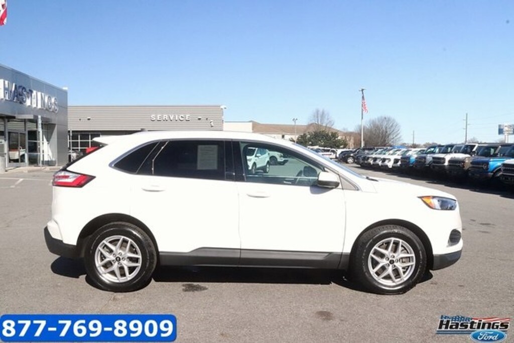Star White Metallic Tri-Coat 2023 Ford Edge SEL AWD 8-Speed Automatic EcoBoost 2.0L I4 GTDi DOHC Turbocharged VCT Edge SEL, 4D Sport Utility, EcoBoost 2.0L I4 GTDi DOHC Turbocharged VCT, 8-Speed Automatic, AWD, Star White Metallic Tri-Coat, Dune w/ActiveX Seating Material Heated Bucket Seats, 110V/150W AC Power Outlet, 3.80 Axle Ratio, 4-Wheel Disc Brakes, 6 Speakers, ABS brakes, ActiveX Seating Material Heated Bucket Seats, Air Conditioning, Alloy wheels, AM/FM radio: SiriusXM with 360L, Auto High-beam Headlights, Auto-dimming Rear-View mirror, Automatic temperature control, Brake assist, Bumpers: body-color, Compass, Convenience Package, Delay-off headlights, Driver door bin, Driver vanity mirror, Dual front impact airbags, Dual front side impact airbags, Electronic Stability Control, Emergency communication system: SYNC 4 911 Assist, Equipment Group 201A, Fog Lamps w/Iconic Silver Bezel, FordPass Connect, Four wheel independent suspension, Front anti-roll bar, Front Bucket Seats, Front Center Armrest w/Storage, Front dual zone A/C, Front reading lights, Fully automatic headlights, Heated door mirrors, Heated front seats, Illuminated entry, Knee airbag, Leather steering wheel, Leather-Wrapped Steering Wheel, Low tire pressure warning, Occupant sensing airbag, Outside temperature display, Overhead airbag, Overhead console, Panic alarm, Passenger door bin, Passenger vanity mirror, Perimeter Alarm, Power door mirrors, Power driver seat, Power Liftgate, Power passenger seat, Power steering, Power windows, Radio: AM/FM Stereo/MP3 Capable, Rear anti-roll bar, Rear Parking Sensors, Rear reading lights, Rear seat center armrest, Rear window defroster, Rear window wiper, Remote keyless entry, Remote Start System, Silver Roof-Rack Side Rails, SiriusXM w/360L, Speed control, Speed-Sensitive Wipers, Split folding rear seat, Spoiler, Steering wheel mounted audio controls, SYNC 4A w/Enhanced Voice Recognition, Tachometer, Telescoping steering wheel, Tilt steering wheel, Traction control, Trip computer, Universal Garage Door Opener (UGDO), Variably intermittent wipers, Wheels: 18" Sparkle Silver-Painted Aluminum, Wireless Charging Pad, Edge SEL, 4D Sport Utility, EcoBoost 2.0L I4 GTDi DOHC Turbocharged VCT, 8-Speed Automatic, AWD, Star White Metallic Tri-Coat, Dune w/ActiveX Seating Material Heated Bucket Seats.