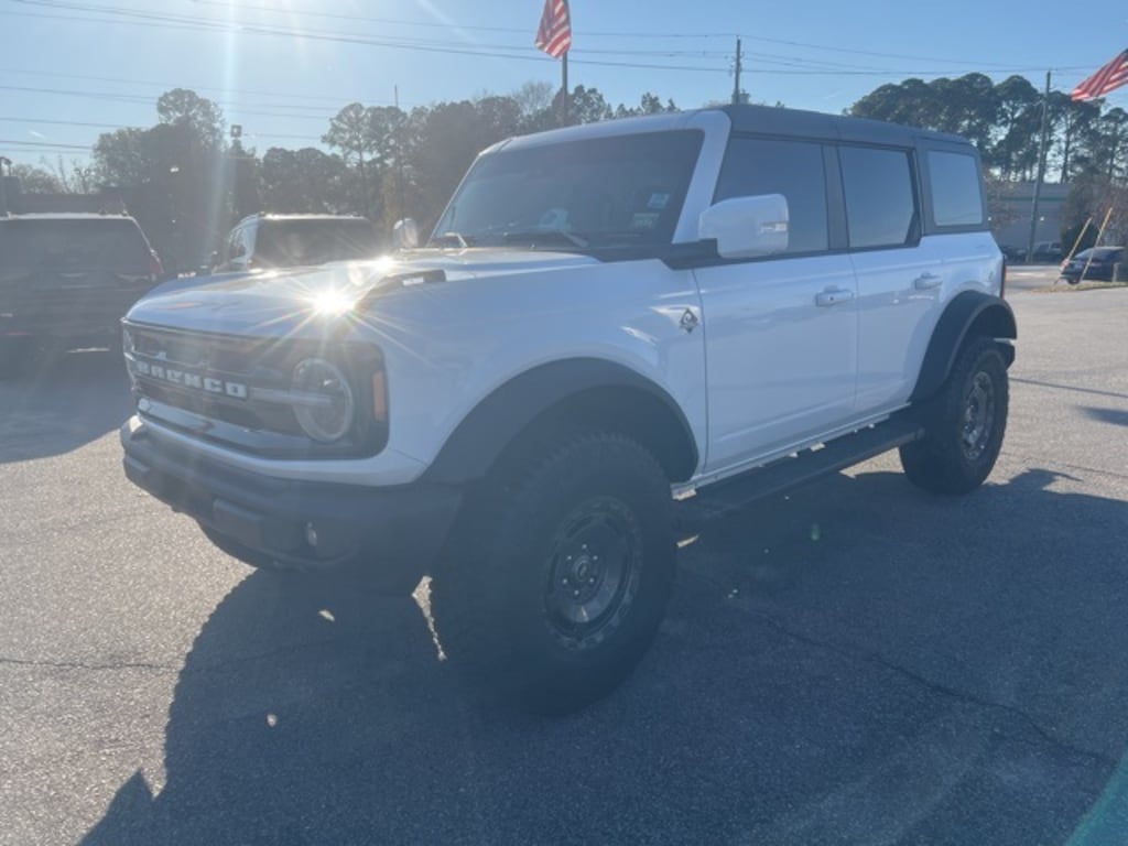 Oxford White 2024 Ford Bronco Outer Banks 4WD 10-Speed Automatic 2.3L EcoBoost I-4 Bronco Outer Banks Advanced, 4D Sport Utility, 2.3L EcoBoost I-4, 10-Speed Automatic, 4WD, Oxford White, Roast W/Black Onyx Leather, 10 Speakers w/Subwoofer, 360-Degree Camera, Adaptive Cruise Control, Additional Sound Deadening, Equipment Group 314A High/Lux Package, Evasive Steering Assist, Front Parking Sensors, Heated Steering Wheel, Information on Demand Panel, Navigation system: Connected Navigation, Radio: B&O Sound System by Bang & Olufsen, Sasquatch Package w/Non Beadlock Capable Wheels, Sideview Mirrors, Universal Garage Door Opener, Wheels: 17" Carbonized Gray-Painted Alloy, Wireless Charging Pad, 18" Bright Machined Aluminum Wheels, 4-Wheel Disc Brakes, 7 Speakers, ABS brakes, Air Conditioning, Alloy wheels, AM/FM radio: SiriusXM with 360L, AM/FM Stereo, Auto High-beam Headlights, Auto-dimming Rear-View mirror, Automatic temperature control, Auxiliary Switches, Brake assist, Carbonized Gray Molded-In-Clr Hard Top w/o Headliner, Compass, Connected Navigation, Delay-off headlights, Driver door bin, Driver vanity mirror, Dual front impact airbags, Dual front side impact airbags, Electronic Stability Control, Emergency communication system: 911 Assist, Exterior Parking Camera Rear, Front & Rear Floor Liners w/o Carpet Floor Mats, Front anti-roll bar, Front Bucket Seats, Front Center Armrest, Front dual zone A/C, Front fog lights, Front reading lights, Front Row Top Panels Storage Bag, Front wheel independent suspension, Fully automatic headlights, Heated door mirrors, Heated front seats, Heated Leather-Trimmed/Vinyl Bucket Seats, Illuminated entry, Integrated roll-over protection, Leather Shift Knob, Low tire pressure warning, Occupant sensing airbag, Outside temperature display, Overhead airbag, Overhead console, Panic alarm, Passenger door bin, Passenger vanity mirror, Power door mirrors, Power driver seat, Power passenger seat, Power steering, Power windows, Radio data system, Rear seat center armrest, Rear-Window Defroster & Washer, Remote keyless entry, Security system, SiriusXM Radio w/360L, Speed control, Split folding rear seat, Steering wheel mounted audio controls, SYNC 4, Tachometer, Telescoping steering wheel, Tilt steering wheel, Traction control, Trip computer, Variably intermittent wipers, Voltmeter, Bronco Outer Banks Advanced, 4D Sport Utility, 2.3L EcoBoost I-4, 10-Speed Automatic, 4WD, Oxford White, Roast W/Black Onyx Leather, 10 Speakers w/Subwoofer, 360-Degree Camera, Adaptive Cruise Control, Additional Sound Deadening, Equipment Group 314A High/Lux Package, Evasive Steering Assist, Front Parking Sensors, Heated Steering Wheel, Information on Demand Panel, Navigation system: Connected Navigation, Radio: B&O Sound System by Bang & Olufsen, Sasquatch Package w/Non Beadlock Capable Wheels, Sideview Mirrors, Universal Garage Door Opener, Wheels: 17" Carbonized Gray-Painted Alloy, Wireless Charging Pad.