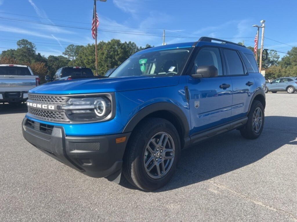 Velocity Blue Metallic 2025 Ford Bronco Sport Big Bend 4WD 8-Speed Automatic 1.5L EcoBoost Bronco Sport Big Bend, 4D Sport Utility, 1.5L EcoBoost, 8-Speed Automatic, 4WD, Velocity Blue Metallic, Medium Lt Smoked Truffle Cloth, Equipment Group 200A, 4-Wheel Disc Brakes, 6 Speakers, ABS brakes, Air Conditioning, Alloy wheels, AM/FM radio: SiriusXM, AM/FM Stereo, Auto High-beam Headlights, Automatic temperature control, Brake assist, Cloth w/Easy-to-Clean Front Bucket Seats, Compass, Delay-off headlights, Driver door bin, Driver vanity mirror, Dual front impact airbags, Dual front side impact airbags, Electronic Stability Control, Emergency communication system: SYNC 4 911 Assist, Four wheel independent suspension, Front anti-roll bar, Front Bucket Seats, Front Center Armrest, Front License Plate Bracket, Front reading lights, Fully automatic headlights, Heated door mirrors, Illuminated entry, Knee airbag, Low tire pressure warning, Occupant sensing airbag, Outside temperature display, Overhead airbag, Overhead console, Panic alarm, Passenger door bin, Passenger vanity mirror, Power door mirrors, Power steering, Power windows, Radio data system, Rear anti-roll bar, Rear Parking Sensors, Rear reading lights, Rear seat center armrest, Rear window defroster, Rear window wiper, Remote keyless entry, Security system, SiriusXM, Speed control, Speed-sensing steering, Speed-Sensitive Wipers, Split folding rear seat, Steering wheel mounted audio controls, SYNC 4 w/Enhanced Voice Recognition, Tachometer, Telescoping steering wheel, Tilt steering wheel, Traction control, Trip computer, Variably intermittent wipers, Wheels: 17" Carbonized Gray-Painted Aluminum, Bronco Sport Big Bend, 4D Sport Utility, 1.5L EcoBoost, 8-Speed Automatic, 4WD, Velocity Blue Metallic, Medium Lt Smoked Truffle Cloth, Equipment Group 200A.