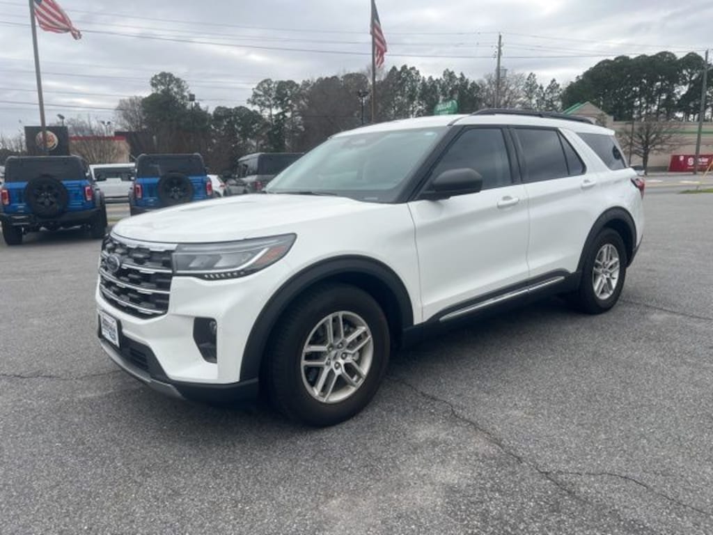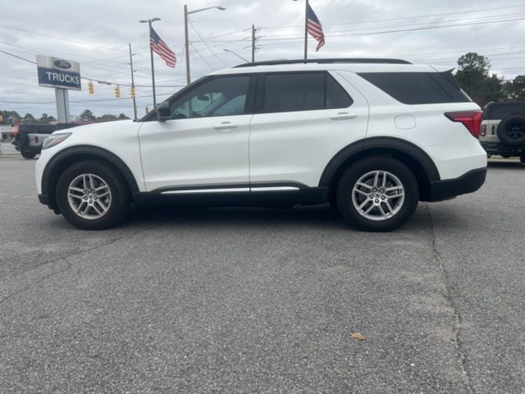Star White Metallic Tri-Coat 2025 Ford Explorer Active RWD 10-Speed Automatic 2.3L EcoBoost I-4 Explorer Active, 4D Sport Utility, 2.3L EcoBoost I-4, 10-Speed Automatic, RWD, Star White Metallic Tri-Coat, Ultra Dark Space Gray Leatherette, 3.58 Non-Limited Slip Rear Axle, 3rd row seats: bench, 4-Wheel Disc Brakes, 6 Speakers, ABS brakes, Active Comfort Package, Air Conditioning, Alloy wheels, AM/FM radio: SiriusXM with 360L, AM/FM Stereo, Apple CarPlay/Android Auto, Auto High-beam Headlights, Automatic temperature control, Brake assist, Bumpers: body-color, Compass, Delay-off headlights, Driver door bin, Driver vanity mirror, Dual front impact airbags, Dual front side impact airbags, Electronic Stability Control, Emergency communication system: 911 Assist, Equipment Group 200A Standard Package, Exterior Parking Camera Rear, Four wheel independent suspension, Front anti-roll bar, Front Bucket Seats, Front Center Armrest, Front dual zone A/C, Front Fascia, Front reading lights, Fully automatic headlights, Heated ActiveX Seating Material Captain's Chairs, Heated door mirrors, Heated front seats, Heated Steering Wheel, Illuminated entry, Internet access capable: FordPass Connect 5G, Knee airbag, Leather steering wheel, Low tire pressure warning, Navigation System, Occupant sensing airbag, Outside temperature display, Overhead airbag, Overhead console, Panic alarm, Passenger door bin, Passenger vanity mirror, Power door mirrors, Power driver seat, Power Liftgate, Power passenger seat, Power steering, Power windows, Rear air conditioning, Rear anti-roll bar, Rear reading lights, Rear window defroster, Rear window wiper, Remote keyless entry, Remote Start System, Second Row HVAC Controls, Security system, Speed control, Speed-sensing steering, Speed-Sensitive Wipers, Split folding rear seat, Spoiler, Steering wheel mounted audio controls, Tachometer, Telescoping steering wheel, Tilt steering wheel, Traction control, Trip computer, Unique Heated Cloth Captain's Chairs, Universal Garage Door Opener (UGDO), Variably intermittent wipers, Wheels: 18" Sparkle Silver-Painted Aluminum, Explorer Active, 4D Sport Utility, 2.3L EcoBoost I-4, 10-Speed Automatic, RWD, Star White Metallic Tri-Coat, Ultra Dark Space Gray Leatherette.