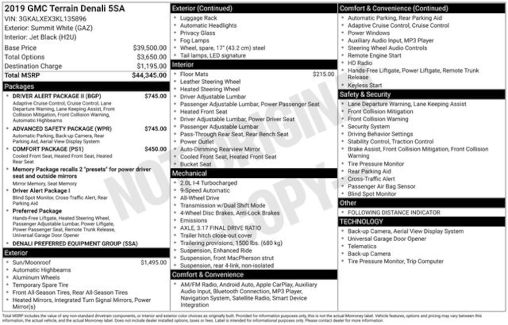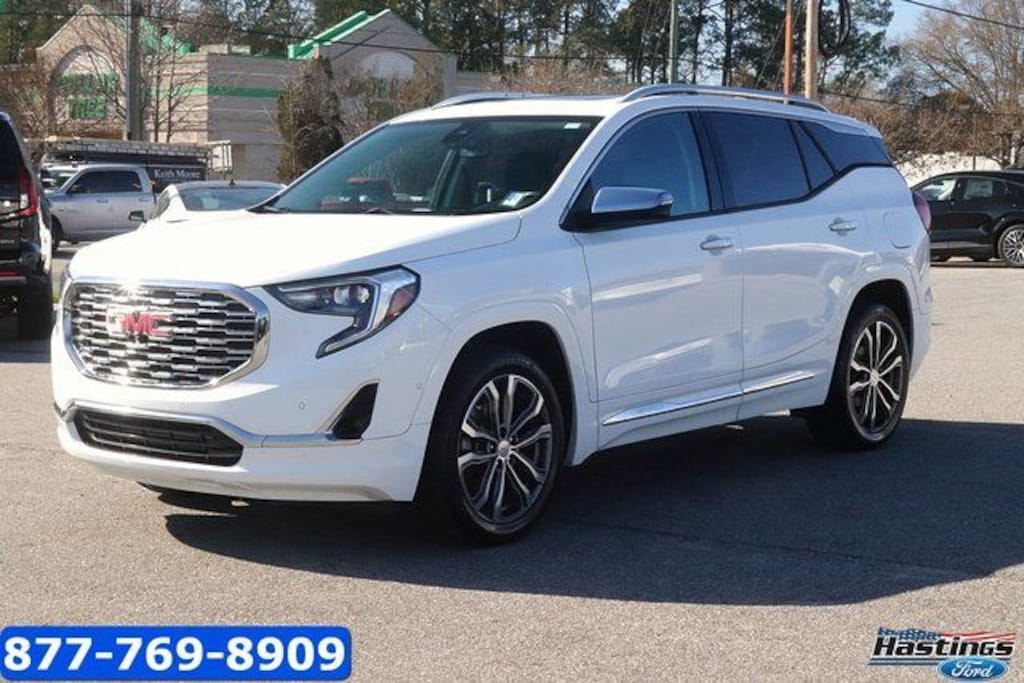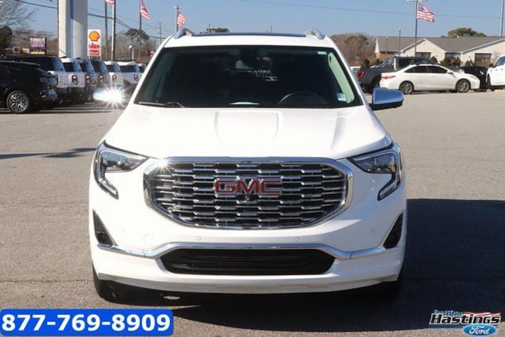 Summit White 2019 GMC Terrain Denali AWD 9-Speed Automatic 2.0L Turbocharged Terrain Denali, 4D Sport Utility, 2.0L Turbocharged, 9-Speed Automatic, AWD, Summit White, Jet Black Leather, Adaptive Cruise Control - Camera, Advanced Safety Package, Automatic Parking Assist, Comfort Package, Driver Alert Package II, Following Distance Indicator, Forward Collision Alert, Front Pedestrian Braking, HD Surround Vision, Heated Rear Outboard Seating Positions, IntelliBeam Auto High Beam Headlamp Control, Lane Keep Assist w/Lane Departure Warning, Low Speed Forward Automatic Braking, Ventilated Driver Seat, Ventilated Front Passenger Seat, 2 USB Data Ports, 2 USB Data Ports w/SD Card Reader, 3.17 Axle Ratio, 4-Wheel Disc Brakes, 6-Way Power Front Passenger Seat, 7 Speakers, 8-Way Power Driver Seat Adjuster, ABS brakes, Air Conditioning, Alloy wheels, AM/FM radio: SiriusXM, Apple CarPlay/Android Auto, Auto-dimming door mirrors, Auto-dimming Rear-View mirror, Automatic temperature control, Bluetooth® For Phone, Brake assist, Bumpers: body-color, Compass, Delay-off headlights, Driver & Front Passenger Heated Seats, Driver door bin, Driver vanity mirror, Dual front impact airbags, Dual front side impact airbags, Electronic Stability Control, Emergency communication system, Exterior Parking Camera Rear, Four wheel independent suspension, Front anti-roll bar, Front Bucket Seats, Front Center Armrest, Front dual zone A/C, Front fog lights, Front Passenger 2-Way Power Lumbar, Front reading lights, Fully automatic headlights, Garage door transmitter, HD Radio, Heated door mirrors, Heated front seats, Heated steering wheel, Illuminated entry, Low tire pressure warning, Memory seat, Navigation System, Occupant sensing airbag, Outside temperature display, Overhead airbag, Overhead console, Panic alarm, Passenger door bin, Passenger vanity mirror, Perforated Leather-Appointed Seat Trim w/Denali Logo, Power door mirrors, Power Driver Lumbar Control, Power driver seat, Power Liftgate, Power passenger seat, Power steering, Power windows, Preferred Equipment Group 5SA, Premium 7-Speaker Bose Sound System w/Amplifier, Premium Carpeted Floor Mats (LPO) (DISC), Radio data system, Radio: GMC Infotainment System w/Navigation, Rear anti-roll bar, Rear seat center armrest, Rear window defroster, Rear window wiper, Remote keyless entry, Roof rack: rails only, Security system, SiriusXM Radio, Skyscape Power Sunroof w/Power Sunscreen, Speed control, Speed-sensing steering, Split folding rear seat, Spoiler, Steering wheel mounted audio controls, Tachometer, Telescoping steering wheel, Tilt steering wheel, Traction control, Trip computer, Turn signal indicator mirrors, Variably intermittent wipers, Wheels: 19" x 7.5" Ultra-Bright Machined Aluminum, Terrain Denali, 4D Sport Utility, 2.0L Turbocharged, 9-Speed Automatic, AWD, Summit White, Jet Black Leather, Adaptive Cruise Control - Camera, Advanced Safety Package, Automatic Parking Assist, Comfort Package, Driver Alert Package II, Following Distance Indicator, Forward Collision Alert, Front Pedestrian Braking, HD Surround Vision, Heated Rear Outboard Seating Positions, IntelliBeam Auto High Beam Headlamp Control, Lane Keep Assist w/Lane Departure Warning, Low Speed Forward Automatic Braking, Ventilated Driver Seat, Ventilated Front Passenger Seat.