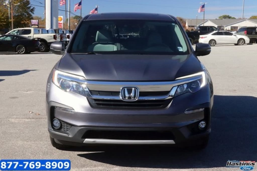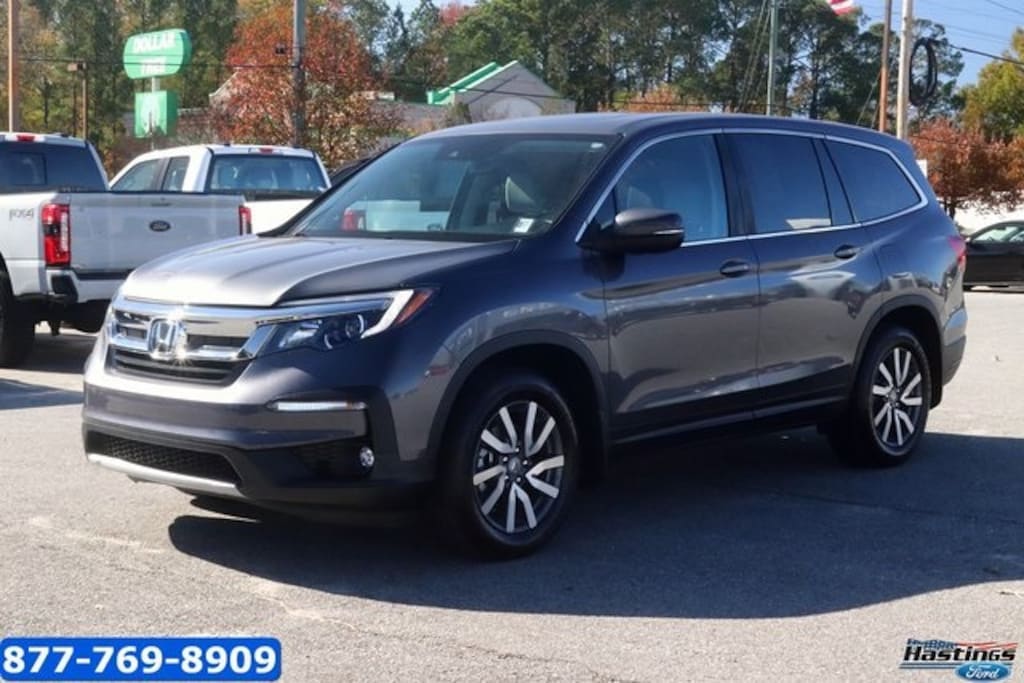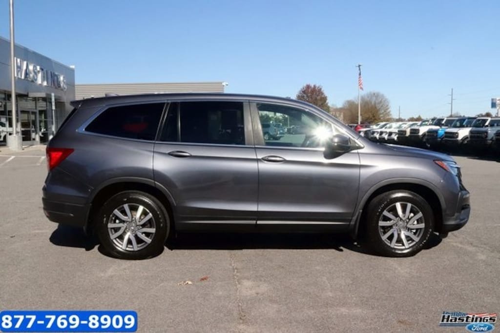 Sonic Gray Pearl 2022 Honda Pilot EX-L FWD 9-Speed Automatic 3.5L V6 24V SOHC i-VTEC Pilot EX-L, 4D Sport Utility, 3.5L V6 24V SOHC i-VTEC, 9-Speed Automatic, FWD, Gray Leather, 18" Machine-Finished Alloy Wheels, 3rd row seats: split-bench, 4-Wheel Disc Brakes, 4.33 Axle Ratio, 7 Speakers, A/V remote: CabinControl, ABS brakes, Air Conditioning, Alloy wheels, AM/FM radio: SiriusXM, Apple CarPlay/Android Auto, Auto High-beam Headlights, Auto-dimming Rear-View mirror, Automatic temperature control, Blind Spot Information (BSI) System warning, Brake assist, Bumpers: body-color, Delay-off headlights, Driver door bin, Driver vanity mirror, Dual front impact airbags, Dual front side impact airbags, Electronic Stability Control, Emergency communication system: HondaLink Assist, Exterior Parking Camera Rear, Forward collision: Collision Mitigation Braking System (CMBS) + FCW mitigation, Four wheel independent suspension, Front anti-roll bar, Front Bucket Seats, Front Center Armrest, Front dual zone A/C, Front fog lights, Front reading lights, Fully automatic headlights, Garage door transmitter: HomeLink, Heated door mirrors, Heated Front Bucket Seats, Heated front seats, Illuminated entry, Lane departure: Lane Keeping Assist System (LKAS) active, Leather Seat Trim, Low tire pressure warning, Memory seat, Occupant sensing airbag, Outside temperature display, Overhead airbag, Overhead console, Panic alarm, Passenger door bin, Passenger vanity mirror, Power door mirrors, Power driver seat, Power Liftgate, Power moonroof, Power passenger seat, Power steering, Power windows, Radio data system, Radio: 215-Watt Audio System, Rear air conditioning, Rear anti-roll bar, Rear reading lights, Rear seat center armrest, Rear window defroster, Rear window wiper, Reclining 3rd row seat, Remote keyless entry, Security system, Speed control, Speed-sensing steering, Speed-Sensitive Wipers, Split folding rear seat, Spoiler, Steering wheel mounted audio controls, Tachometer, Telescoping steering wheel, Tilt steering wheel, Traction control, Trip computer, Turn signal indicator mirrors, Variably intermittent wipers, Pilot EX-L, 4D Sport Utility, 3.5L V6 24V SOHC i-VTEC, 9-Speed Automatic, FWD, Gray Leather.