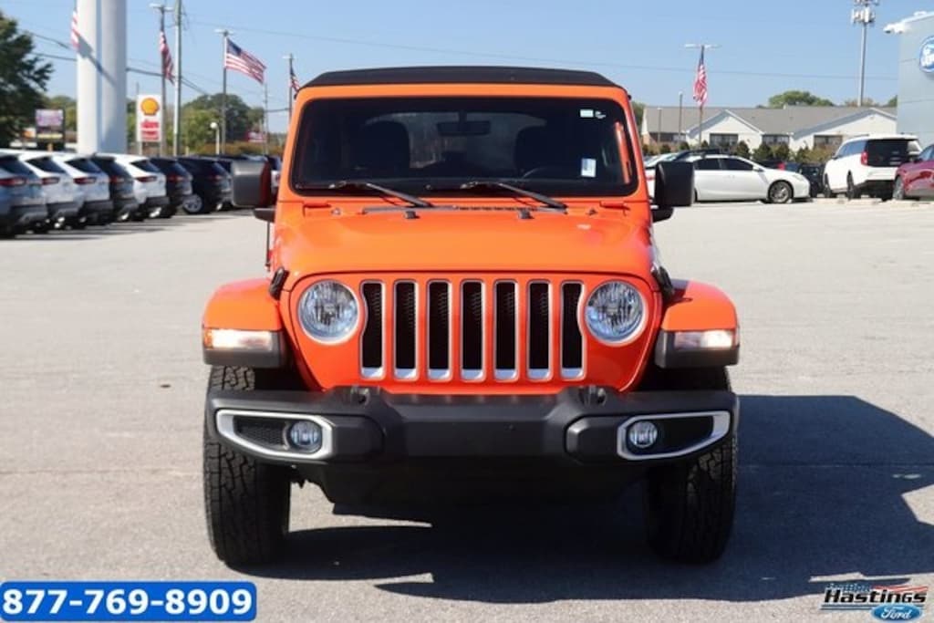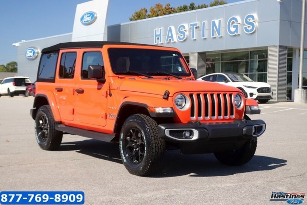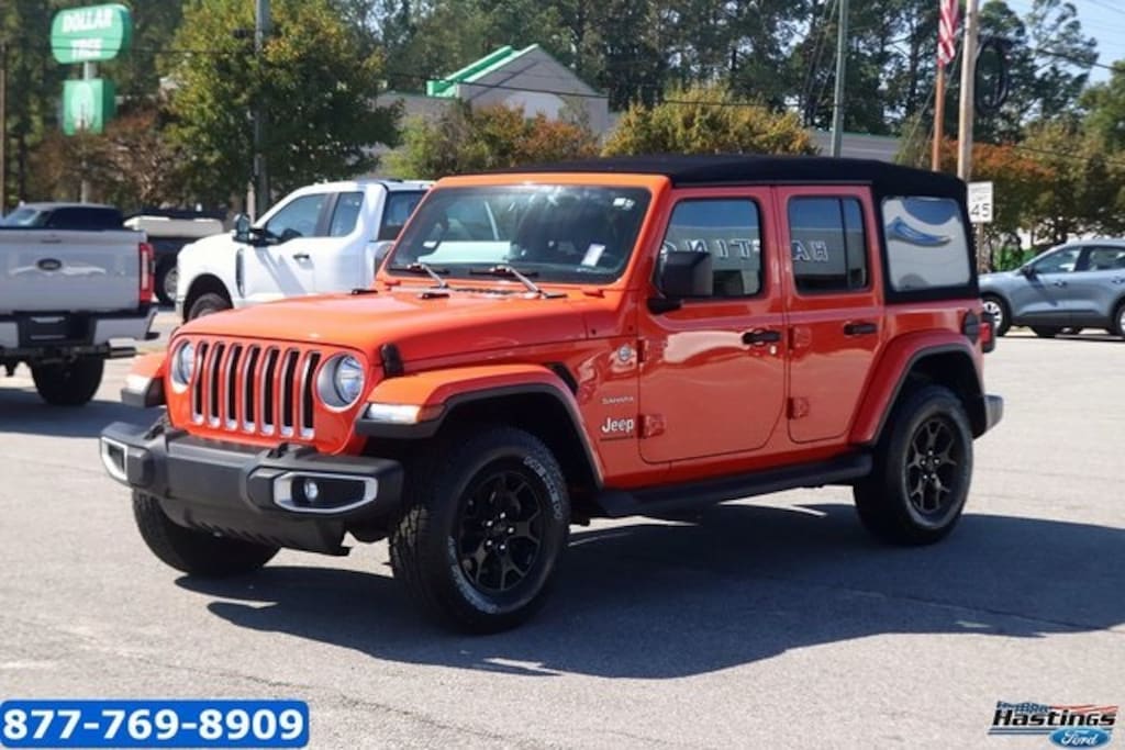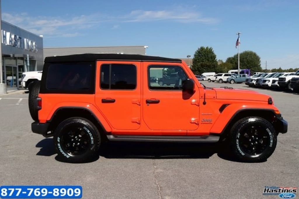 Punkn Metallic Clearcoat 2023 Jeep Wrangler Sahara 4WD 8-Speed Automatic 2.0L I4 DOHC Wrangler Sahara, 4D Sport Utility, 2.0L I4 DOHC, 8-Speed Automatic, 4WD, Punkn Metallic Clearcoat, Black Cloth, Cold Weather Group, Heated Front Seats, Heated Steering Wheel, Quick Order Package 22G Sahara, Remote Start System, 3.45 Overall Top Gear Ratio, 4-Wheel Disc Brakes, 9 Speakers, ABS brakes, Air Conditioning, Alloy wheels, AM/FM radio: SiriusXM, Apple CarPlay/Android Auto, Auto-dimming Rear-View mirror, Automatic temperature control, Aux Battery, Brake assist, Cloth Low-Back Bucket Seats, Compass, Delay-off headlights, Driver door bin, Driver vanity mirror, Dual front impact airbags, Dual front side impact airbags, Electronic Stability Control, Emergency communication system: SiriusXM Guardian, Front anti-roll bar, Front Bucket Seats, Front Center Armrest w/Storage, Front dual zone A/C, Front fog lights, Front reading lights, Fully automatic headlights, Garage door transmitter, Heated door mirrors, Heavy Duty Suspension w/Gas Shocks, Illuminated entry, Integrated roll-over protection, Low tire pressure warning, MOPAR All-Weather Floor Mats, Navigation System, Non-Lock Fuel Cap w/o Discriminator, Occupant sensing airbag, Outside temperature display, Panic alarm, ParkView Rear Back-Up Camera, Passenger door bin, Passenger vanity mirror, Power door mirrors, Power steering, Power windows, Premium Black Sunrider Soft Top, Radio data system, Radio: Uconnect 4C Nav w/8.4" Display, Rear anti-roll bar, Rear reading lights, Remote keyless entry, Security system, Side Steps, Speed control, Split folding rear seat, Steering wheel mounted audio controls, Stop-Start Dual Battery System, Tachometer, Telescoping steering wheel, Tilt steering wheel, Traction control, Trip computer, Variably intermittent wipers, Voltmeter, Wheels: 18" x 7.5" Machined w/Gray Spokes, Wrangler Sahara, 4D Sport Utility, 2.0L I4 DOHC, 8-Speed Automatic, 4WD, Punkn Metallic Clearcoat, Black Cloth, Cold Weather Group, Heated Front Seats, Heated Steering Wheel, Quick Order Package 22G Sahara, Remote Start System.